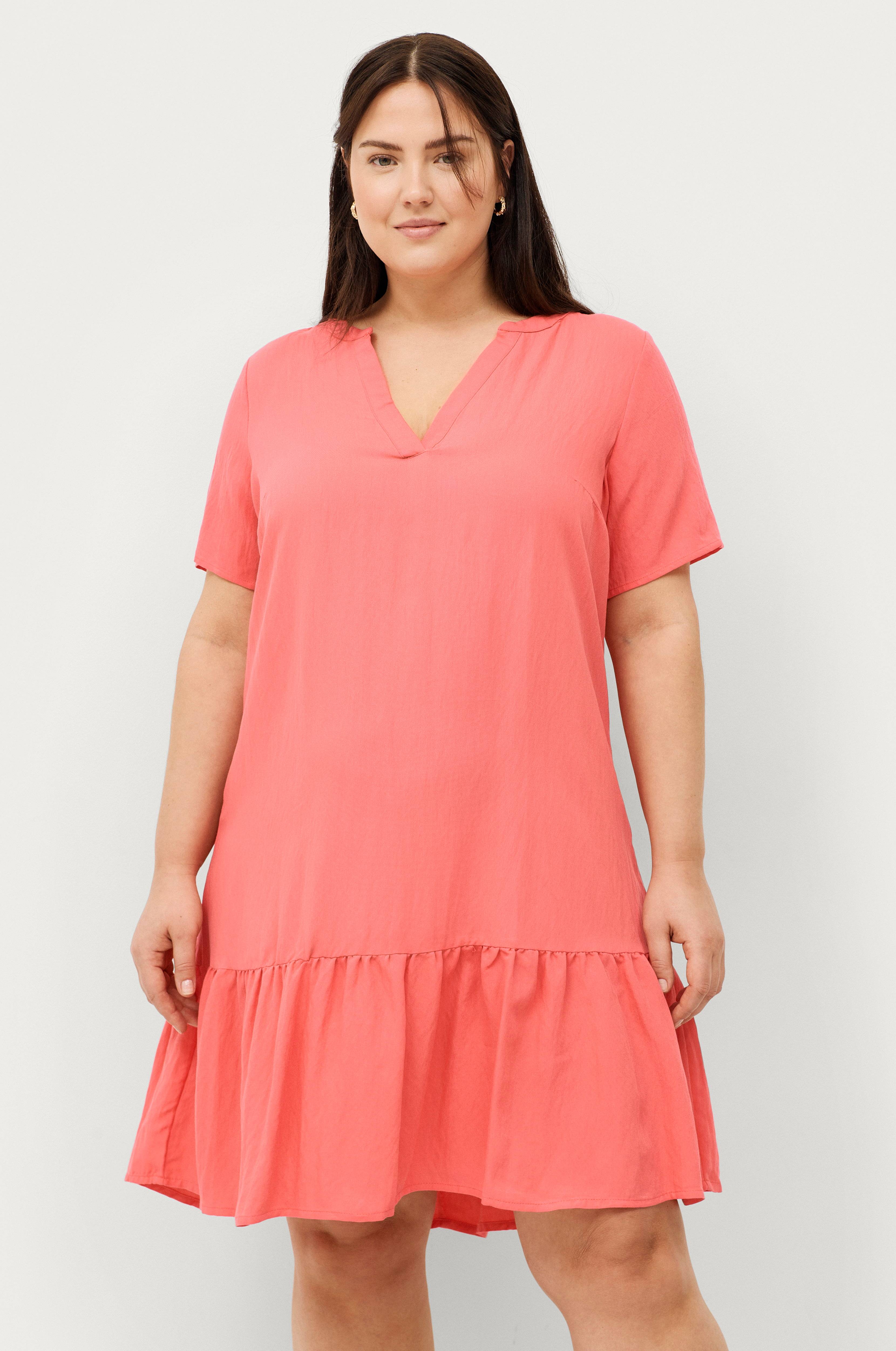• Fremstillet af blød viskose• Løst A-linje design• Kort ærme• V-formet halsudskæring• Volant ved nederste kant• Store størrelser• Længde: 103 cm i størrelse S