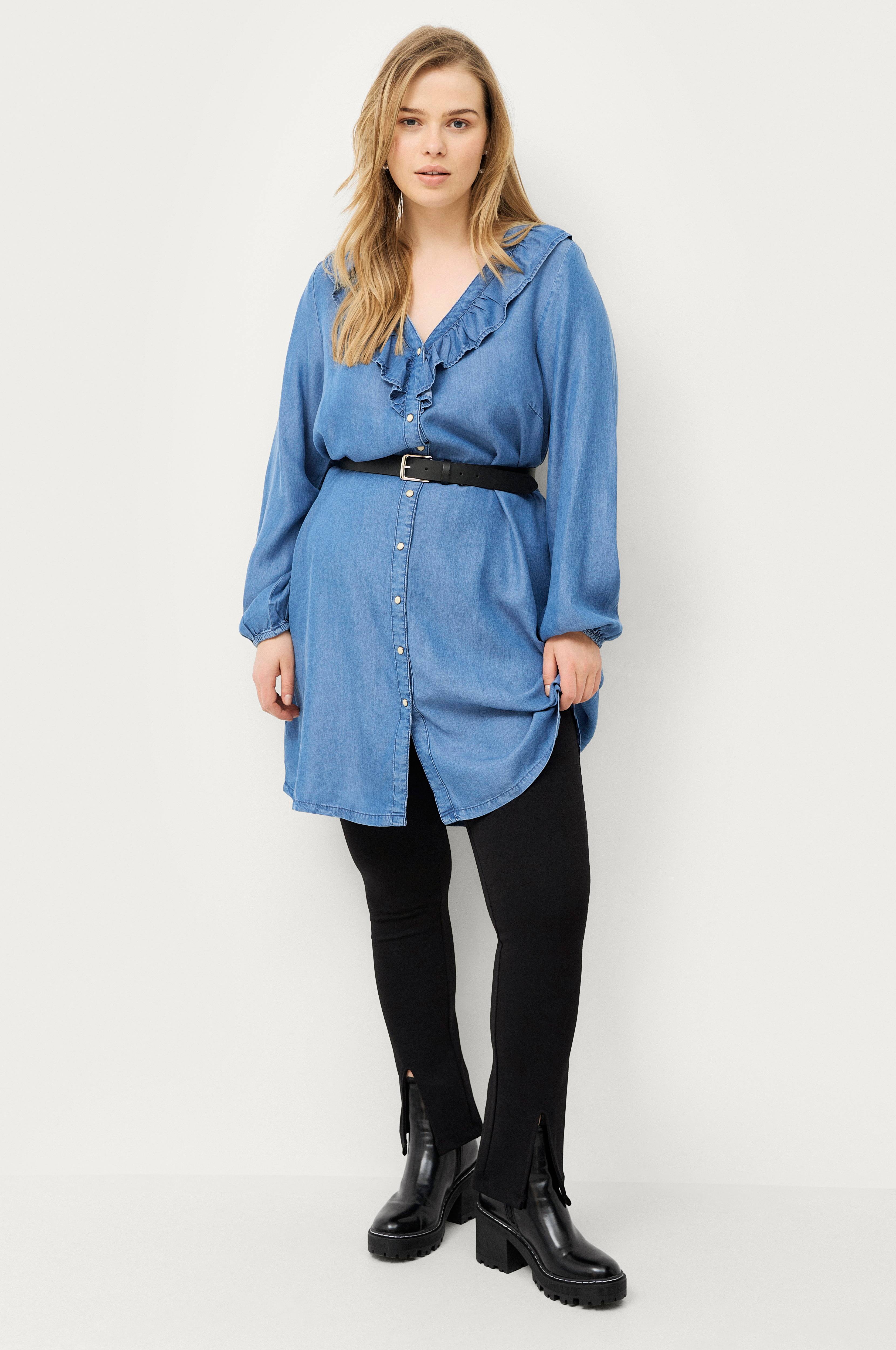 • Løs pasform• V-udskæring med volant• Gennemknappet model• Lange ærmer med elastisk bånd ved manchetterne• Store størrelser• Længde: 98 cm i størrelse 42/44