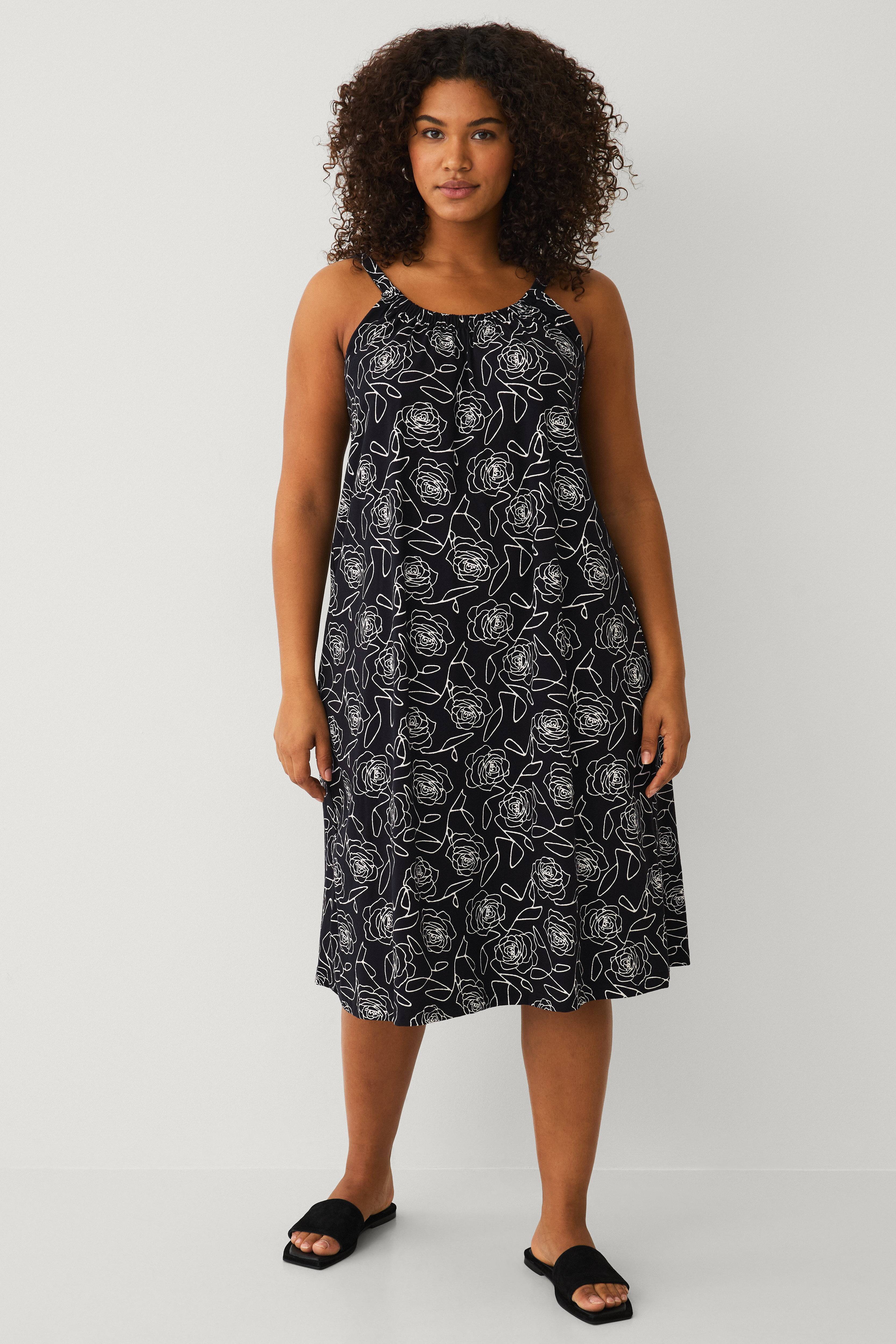 • Kjole i bomuld• Rund halsudskæring• Justérbare skulderstropper• Nedre del med svaj• Plusstørrelser• Længde: 97 cm i størrelse S