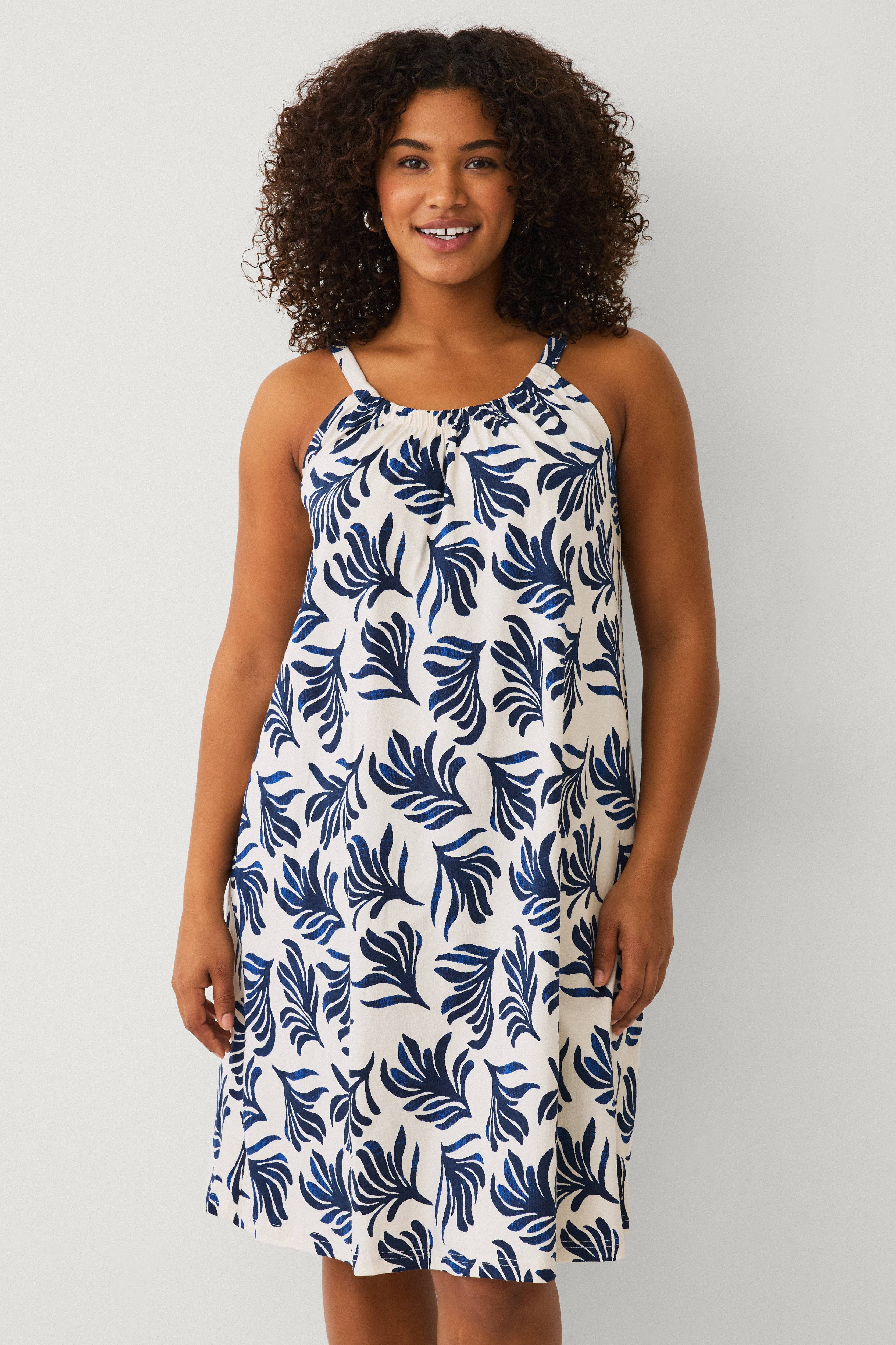 • Kjole i bomuld• Rund halsudskæring• Justérbare skulderstropper• Nedre del med svaj• Plusstørrelser• Længde: 97 cm i størrelse S