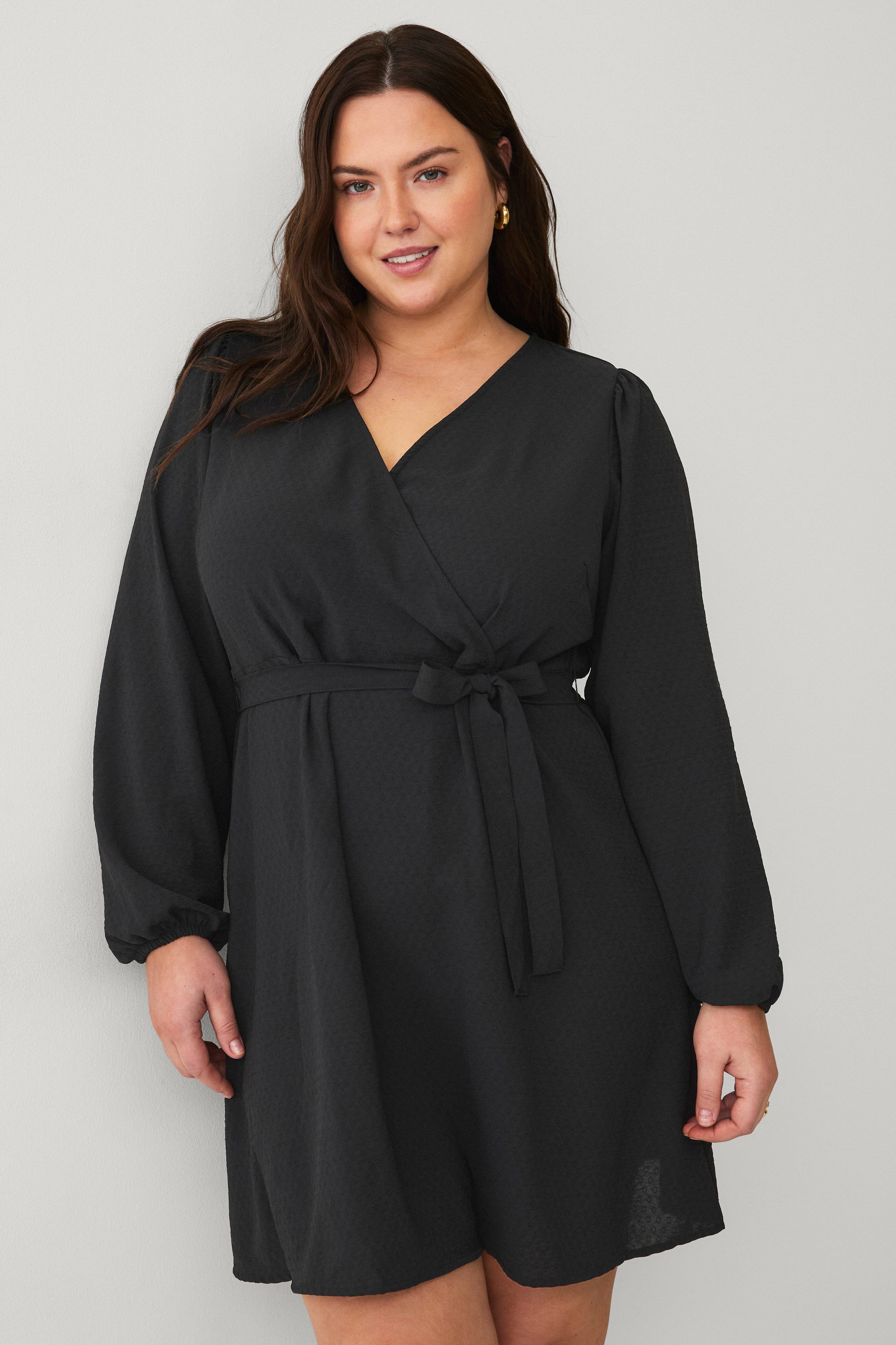 • Store størrelser• Model med svaj med slå-om design på toppen• Langt ballonærme med elastik ved manchetterne• Markeret talje med bindebælte• Længde: 96 cm i størrelse S