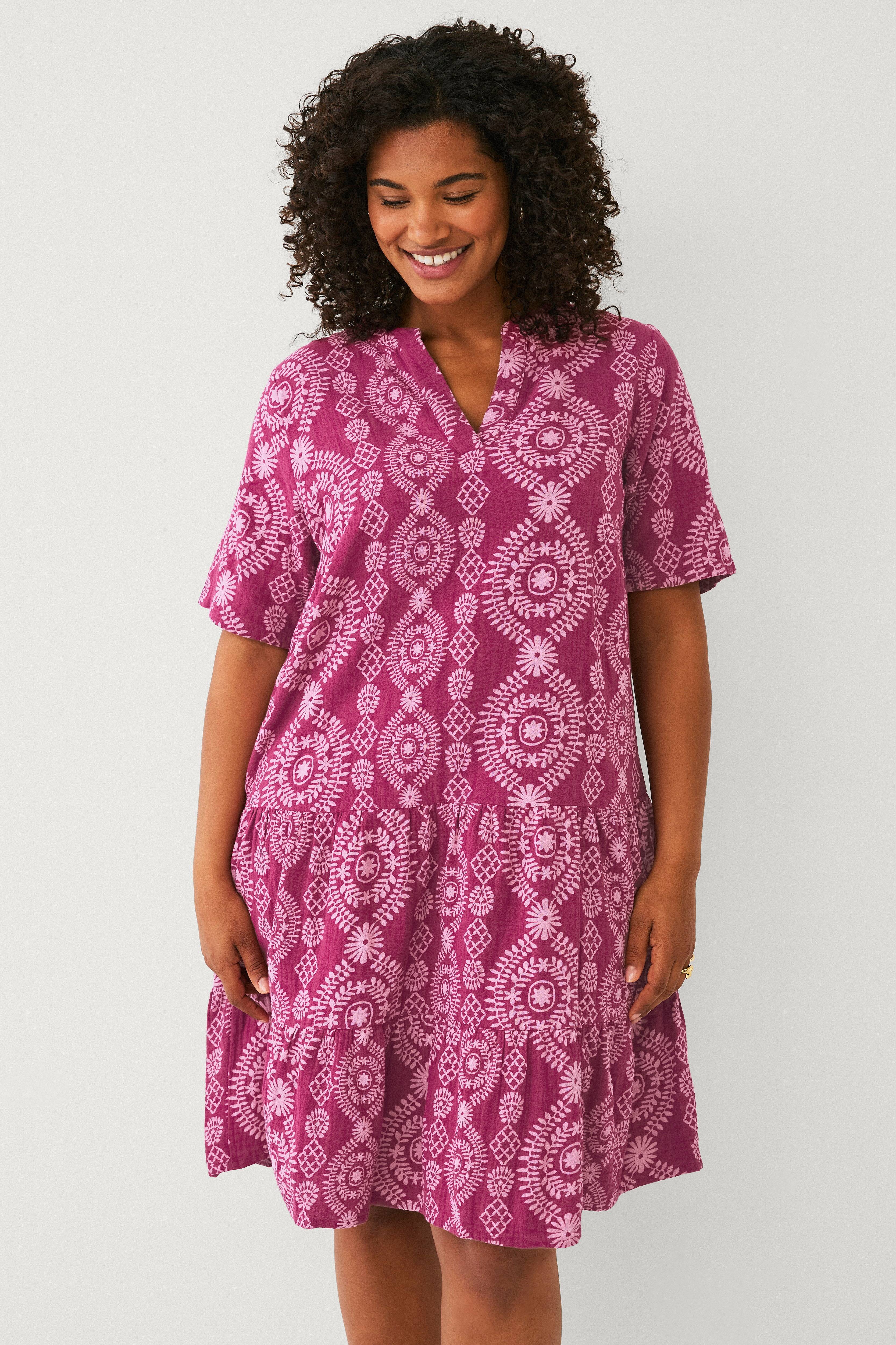 • Store størrelser• Model med svaj• Rund hals med ventilation foran• Kort ærme• Volanter nederst• Længde: 102 cm i størrelse S