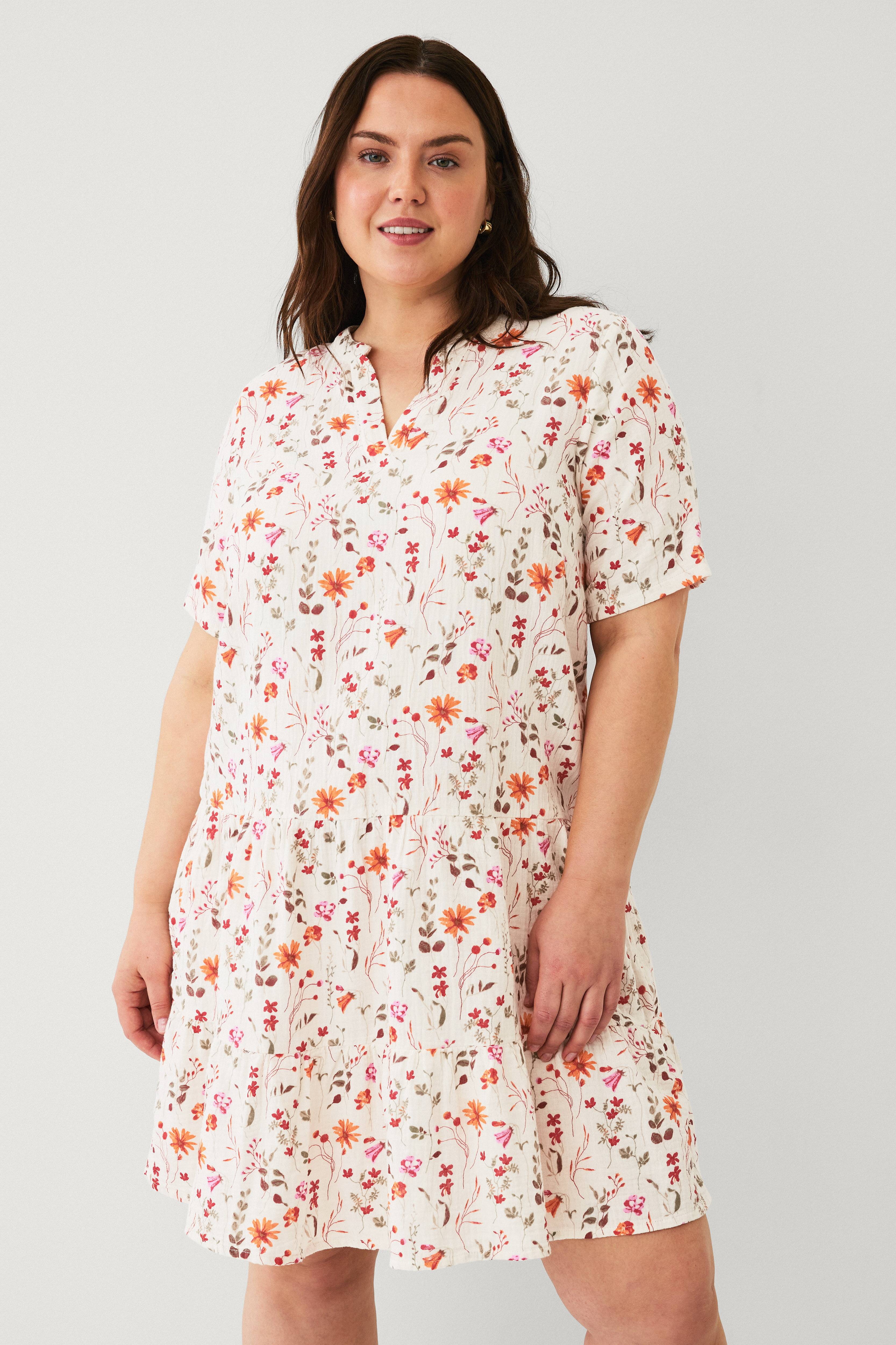 • Store størrelser• Model med svaj• Rund hals med ventilation foran• Kort ærme• Volanter nederst• Længde: 102 cm i størrelse S