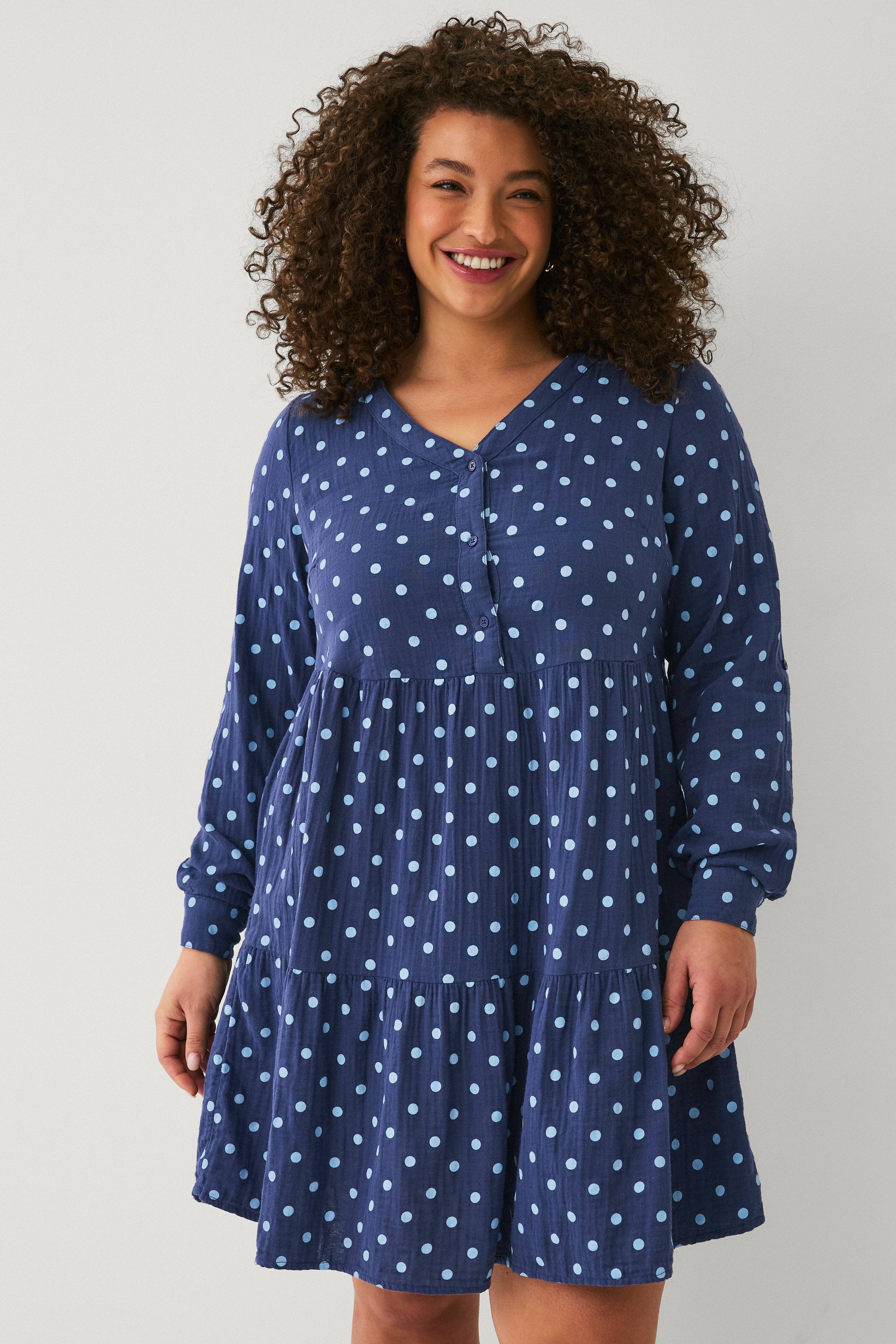 • Store størrelser• Model med svaj• V-formet halsudskæring• Knaplukning foran ned til taljen• Langt ærme med manchet• Rynket talje• Bred nederdel med volant nederst• Længde: 94 cm i størrelse S