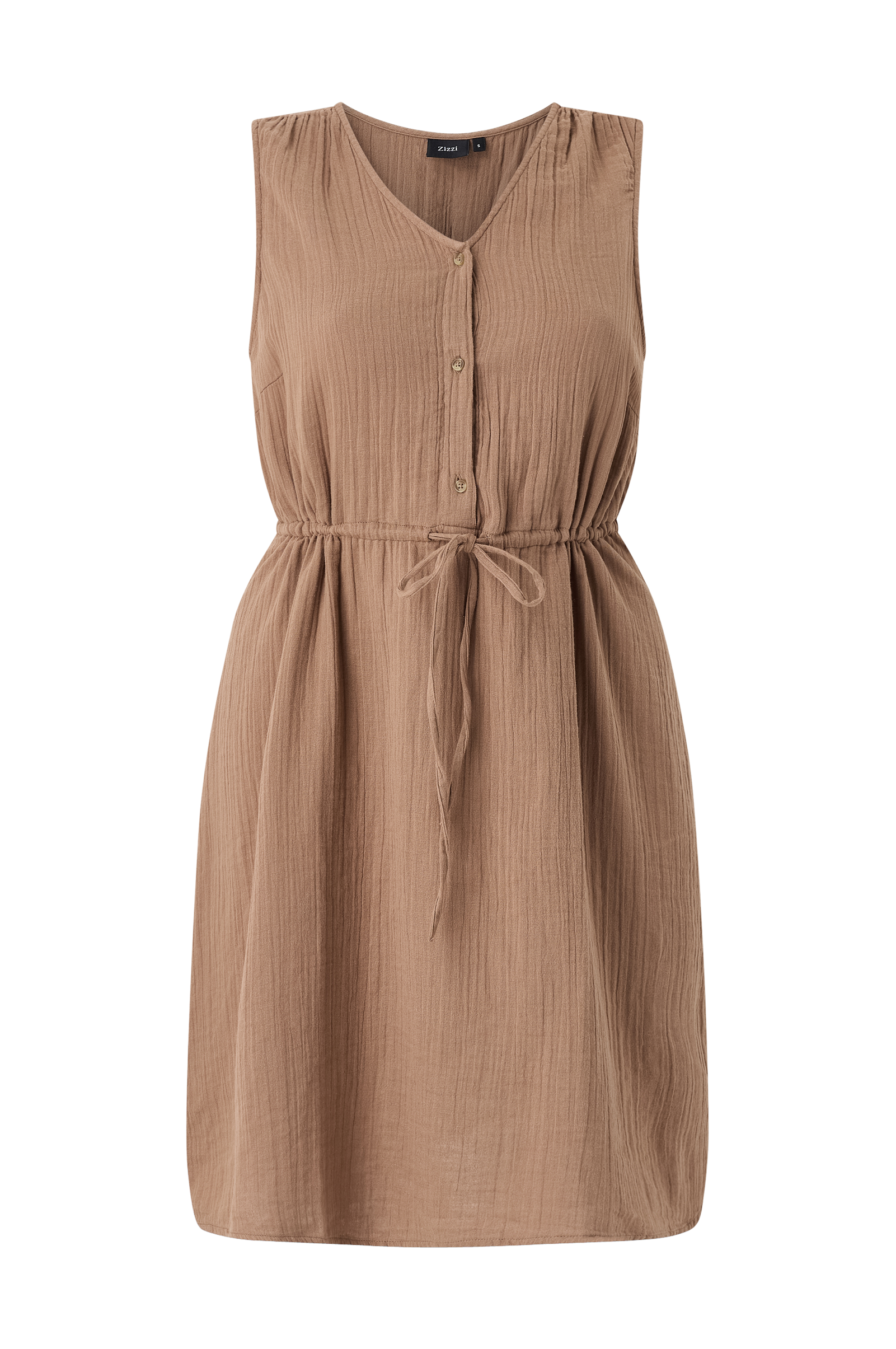 • Ærmeløs kjole i blød, behandlet bomuld• V-udskæring• Knapper oppe foran• Træksnørre ved taljen• Længde: 102 cm i størrelse S• Plusstørrelser