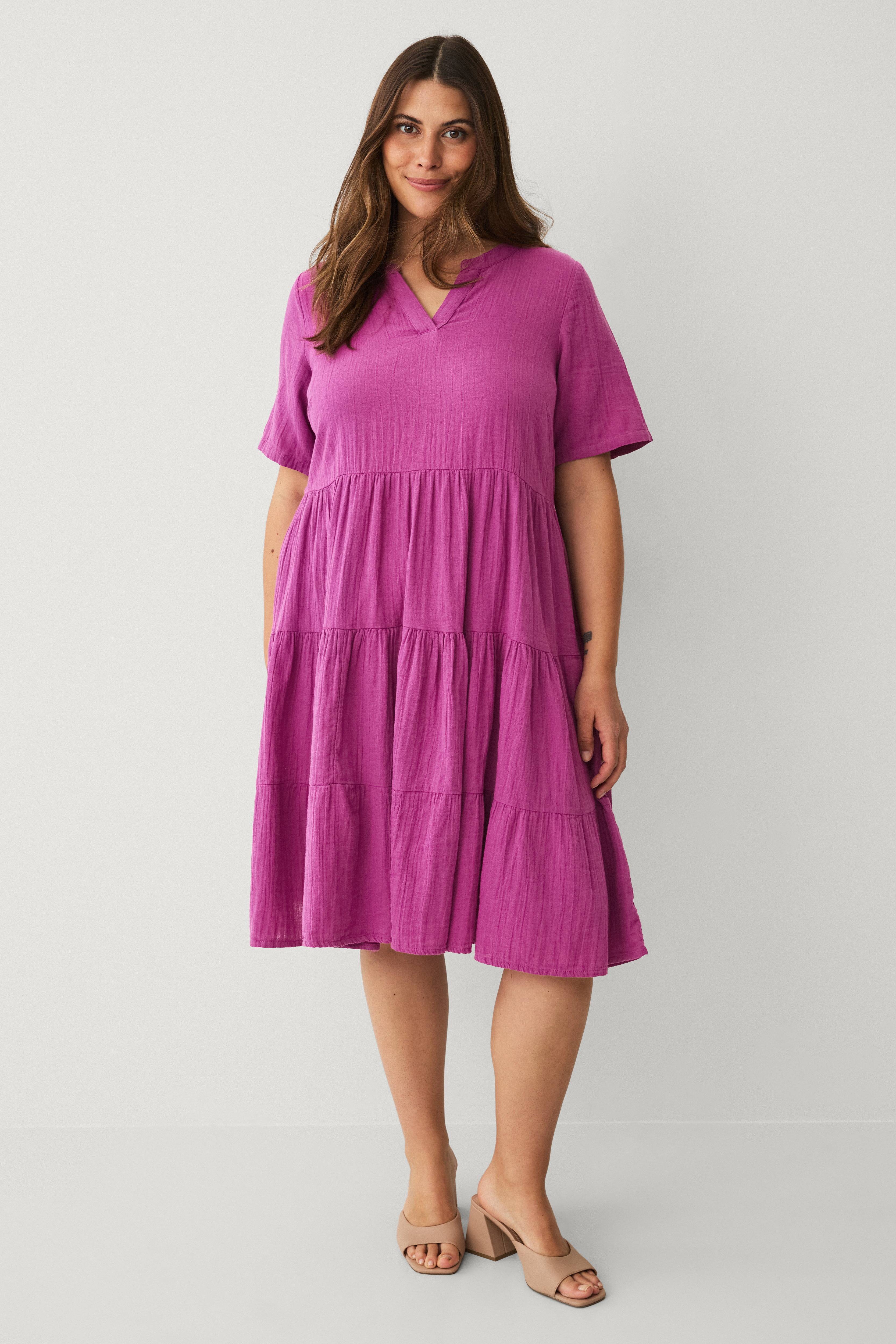 • Knælang kjole i bomuldsmuslin• Løs, a-linjeformet pasform• V-formet halsudskæring• Korte ærmer• Store størrelser• Længde: 105 cm i størrelse S