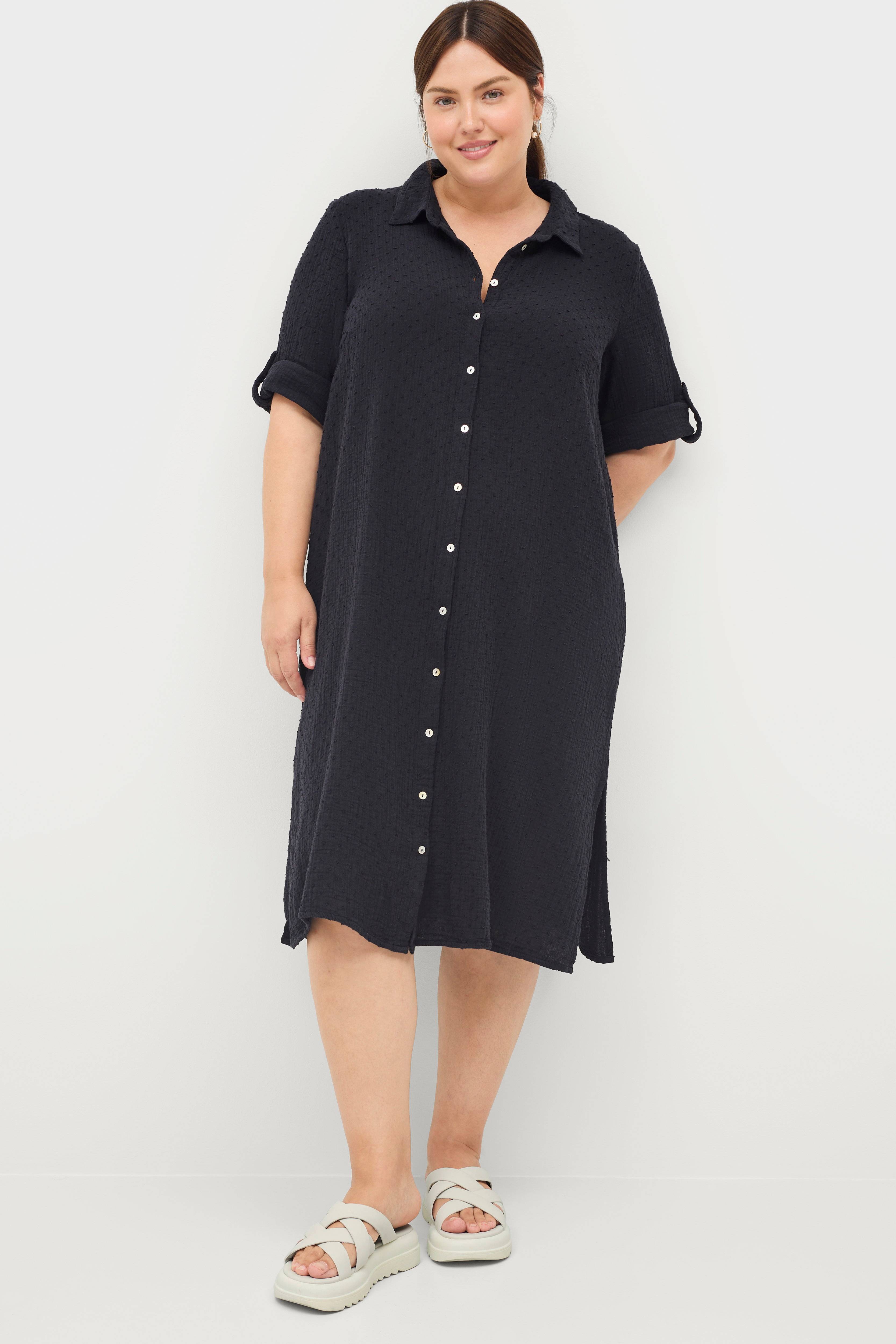 • Skjortekjole i bomuld med prikket struktur• Gennemknappet model• Korte ærmer med oprullet• Løs pasform• Slidser i siderne• Store størrelser• Længde: 112 cm i størrelse S