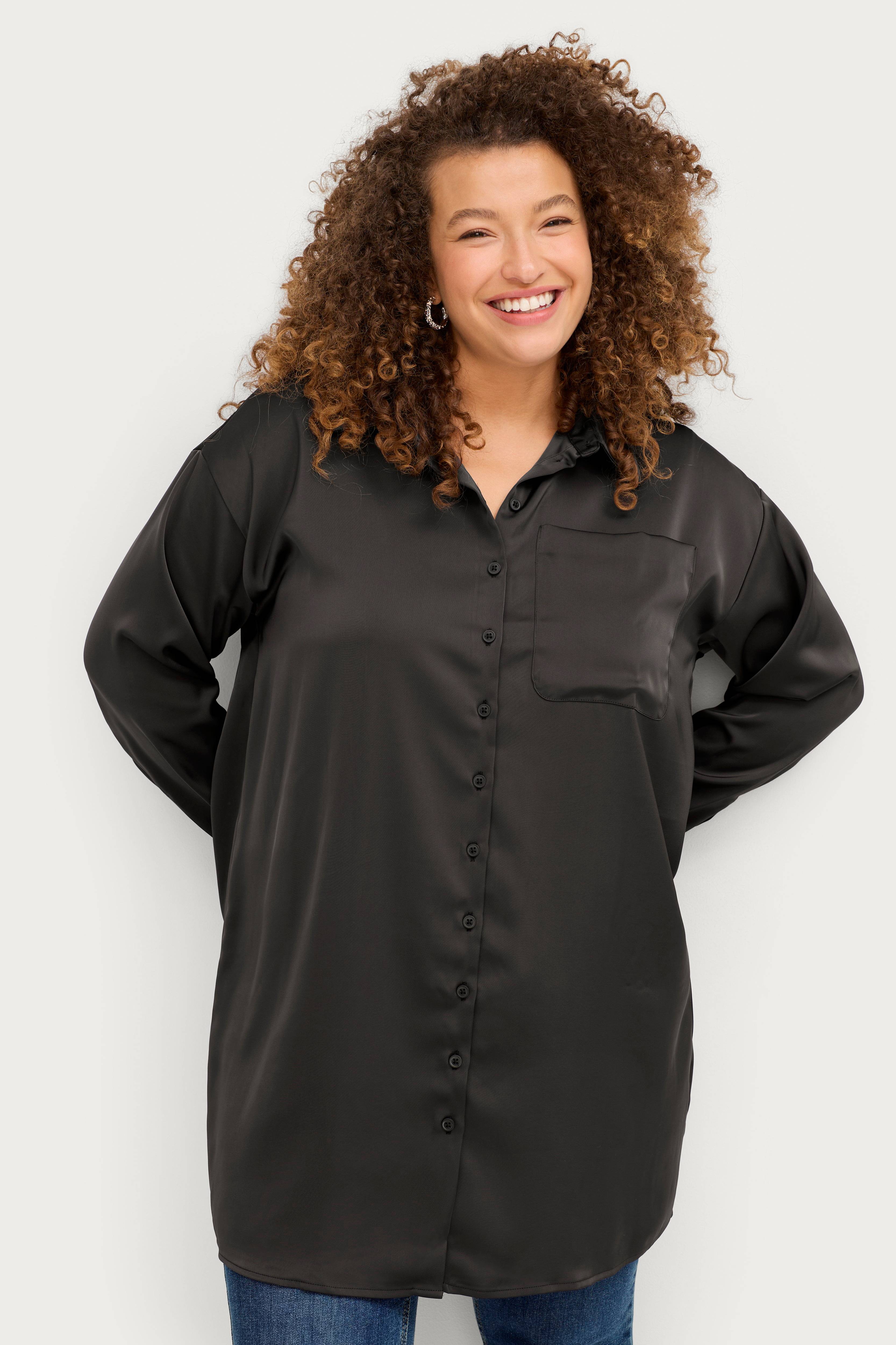 • Lang skjorte i satin• Knapper foran• En brystlomme• Nedsænkede skuldre• Manchet ved manchetterne• Store størrelser