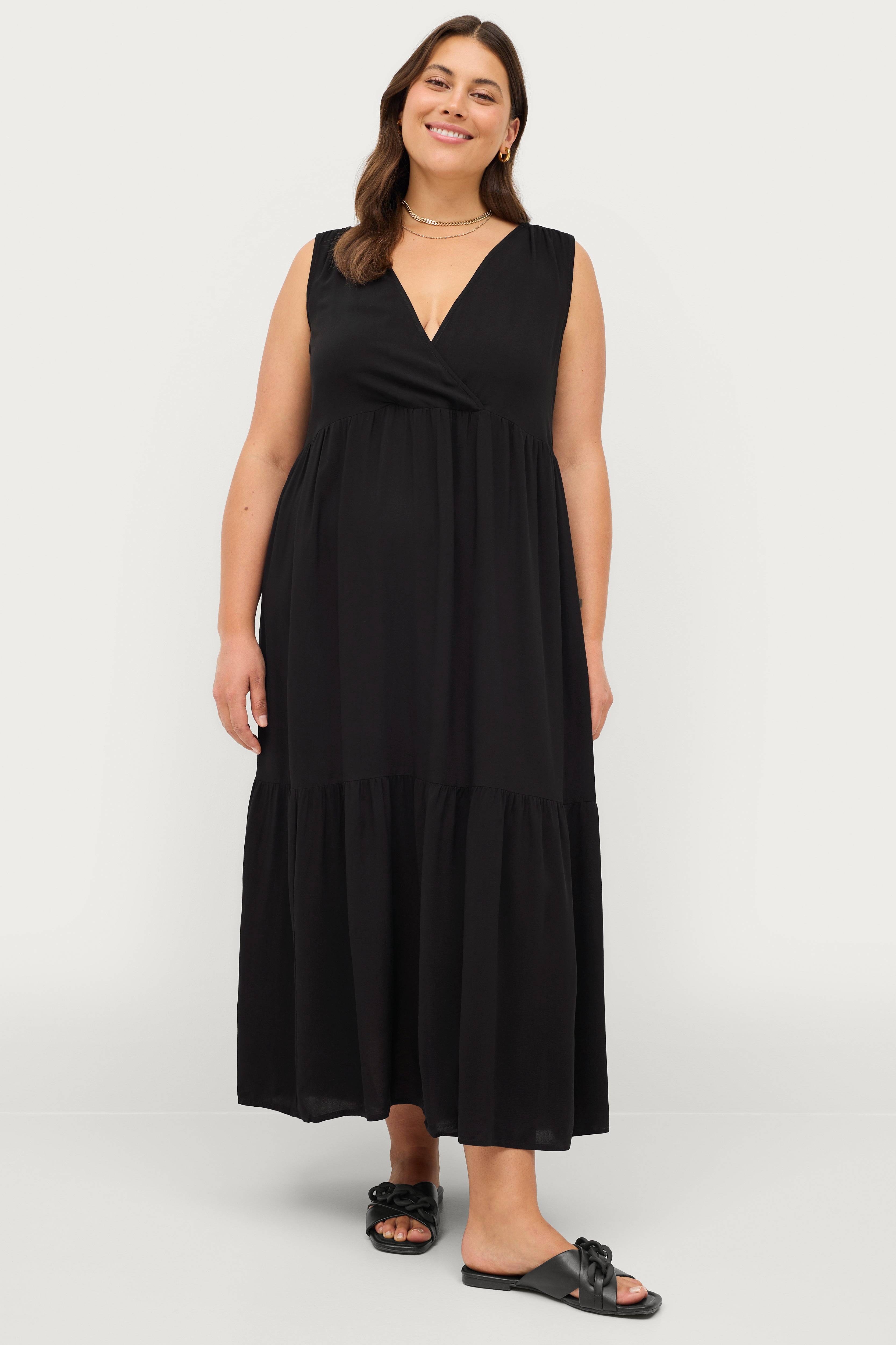 • Lang, ærmeløs kjole• V-udskæring med slå-om• Volant nederst• Store størrelser• Længde: 133 cm i størrelse S