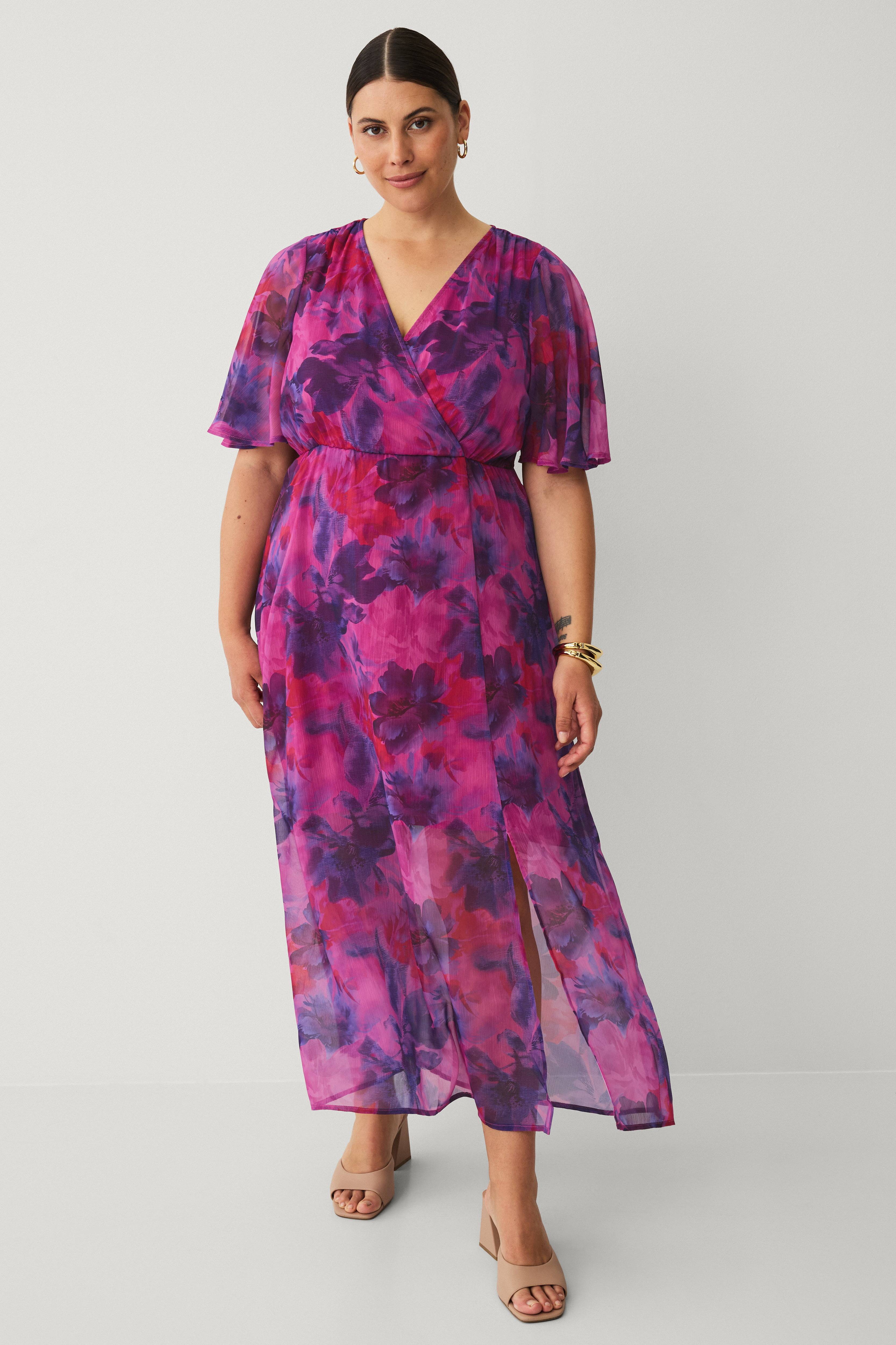 • Lang kjole i chiffon• V-formet halsudskæring med slå-om• Korte sommerfugleærmer• Elastik ved taljen• Skjult lynlås i siden• Kort, blødt for i viskose• Slids nede foran• Store størrelser• Længde: 134 cm i størrelse S