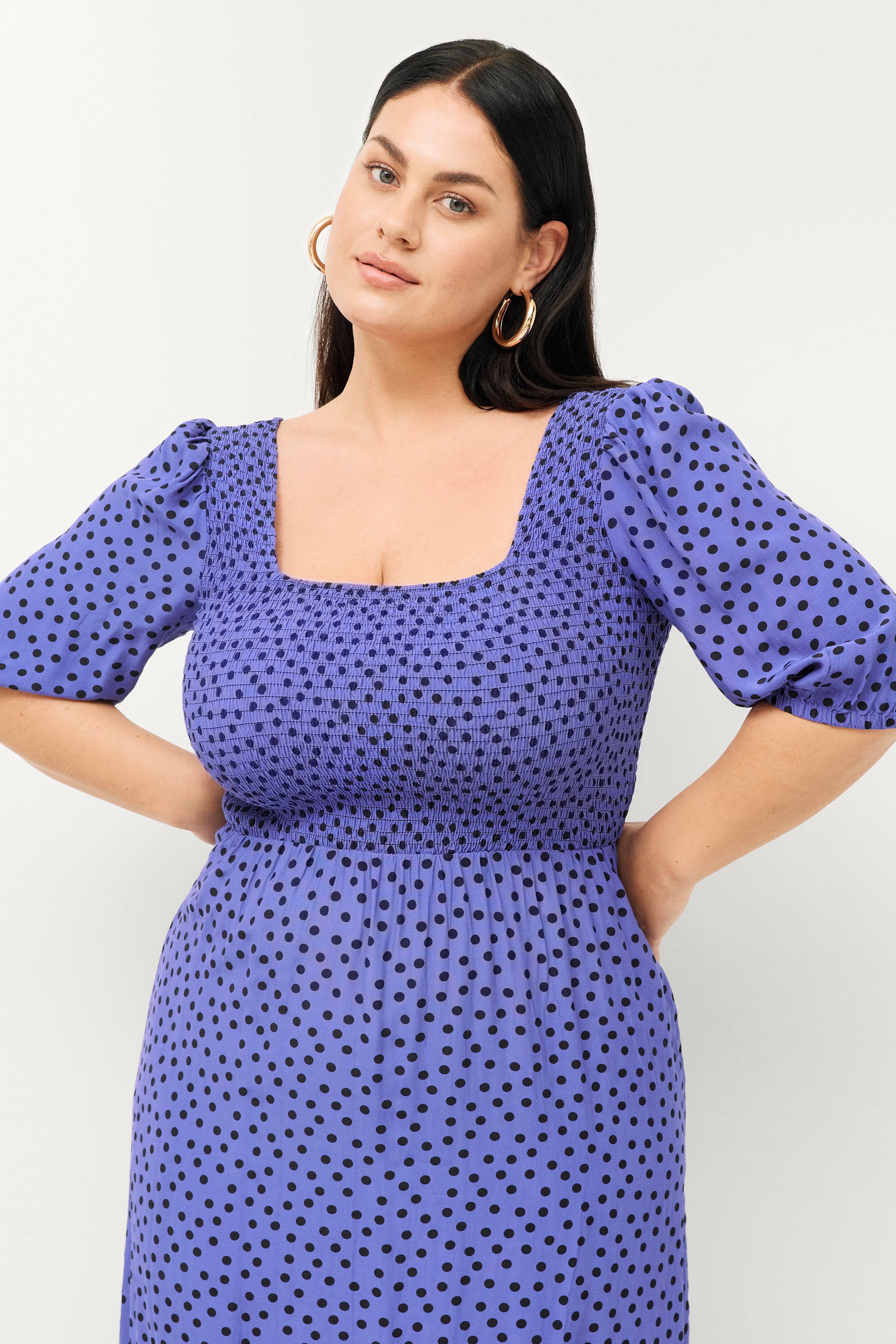 • Smocket, figursyet øvre del• Firkantet halsudskæring• 3/4 lange ballonærmer• Store størrelser• Længde: 131 cm i størrelse S