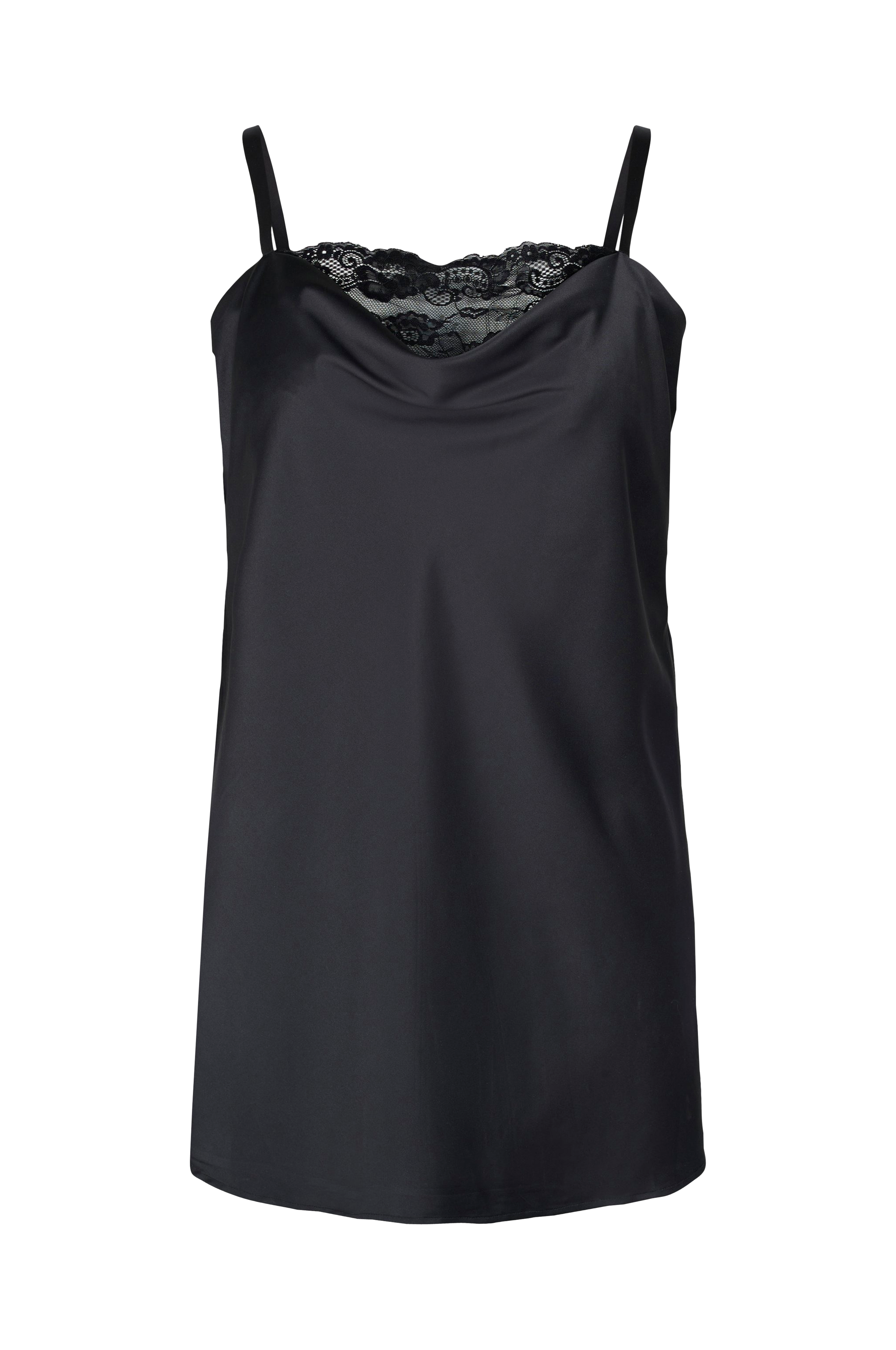 • Ærmeløs model i satin• Justérbare skulderstropper• Blondelag ved brystet• Draperet halsudskæring• Store størrelser