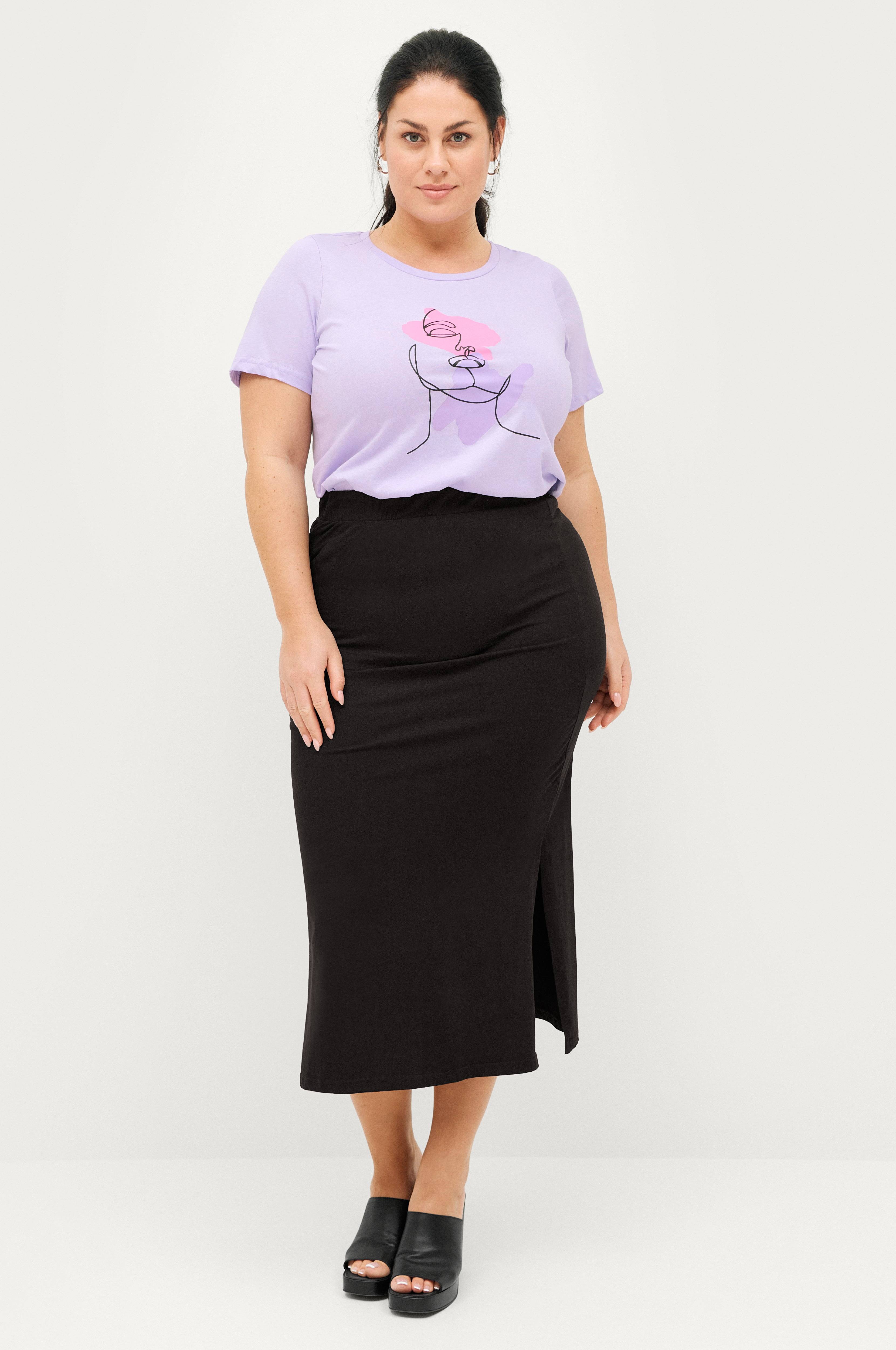 • Figursyet nederdel i bomuldsjersey• Elastisk talje• Slidser i siderne• Store størrelser• Længde: 90 cm i størrelse S