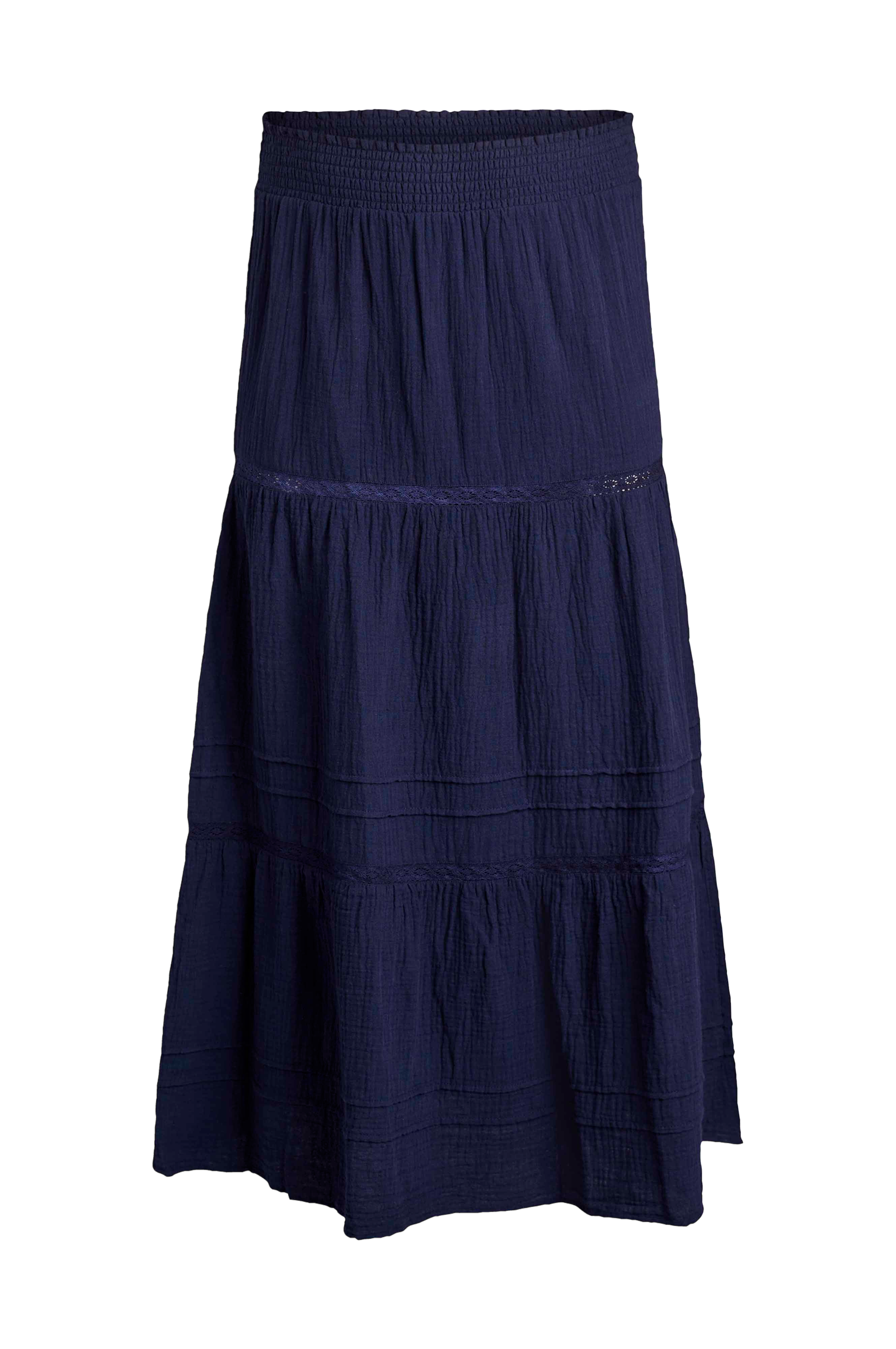 • A-facon midi nederdel i bomuldsmuslin• Smock ved taljen• Dekorative blondebroderier hele vejen rundt• Plusstørrelser• Længde: 89 cm i størrelse S