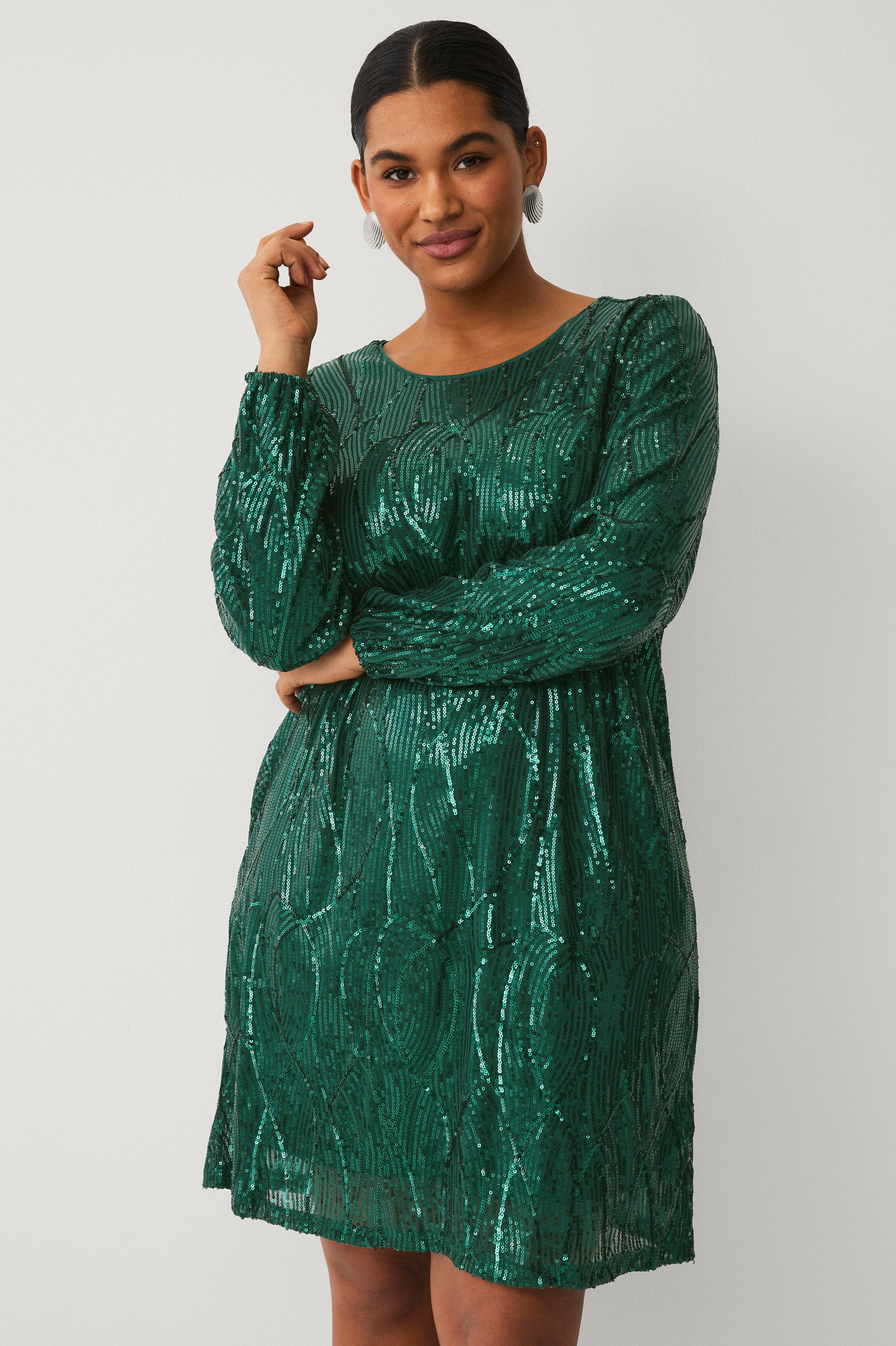 • Foret festkjole med dekorative pailleter• Rund hals• Lange ærmer med elastik ved manchetterne• Store størrelser• Længde: 95 cm i størrelse S