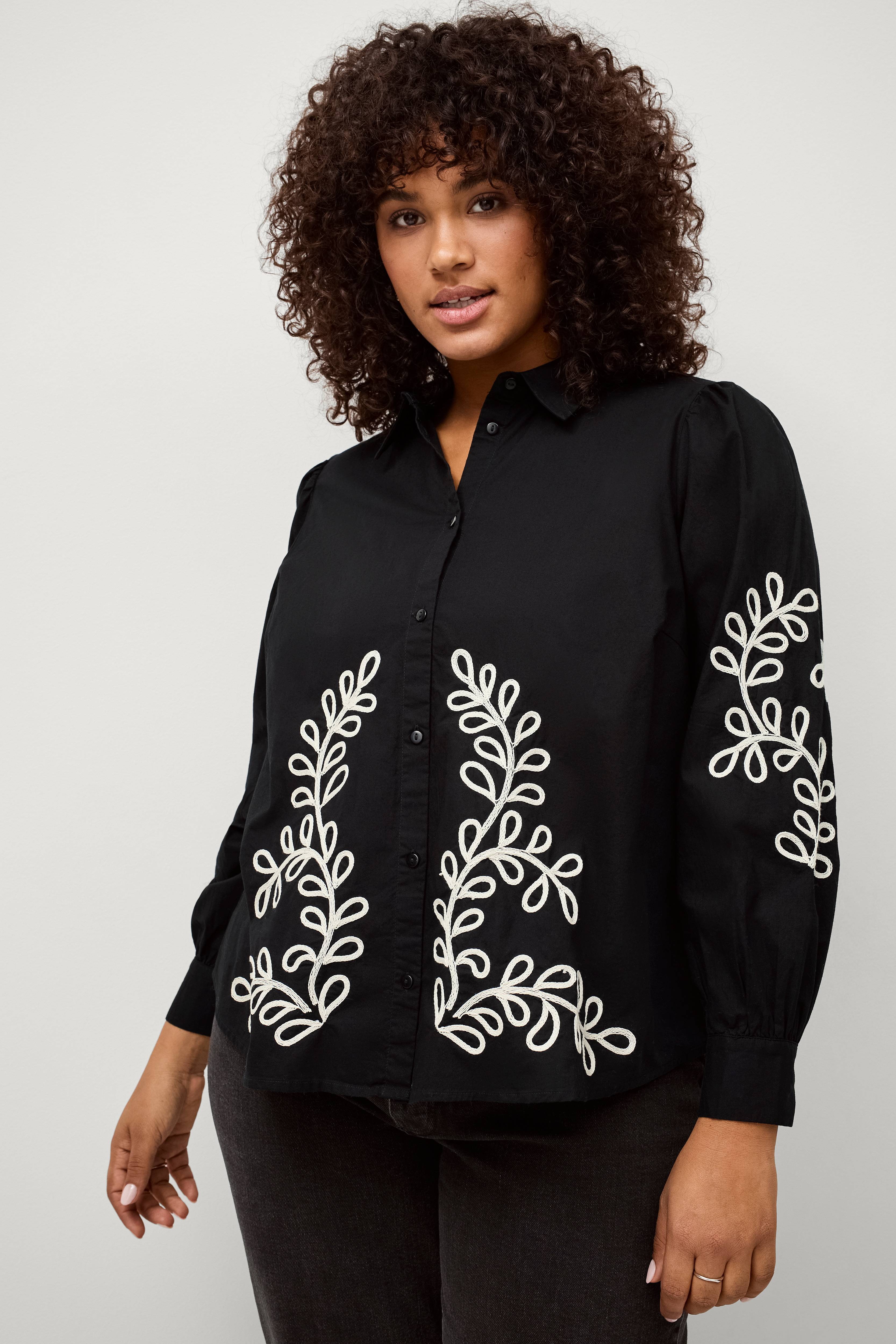 • Store størrelser• Model med svaj med broderier• Langt ballonærme med manchet• Let afrundet søm