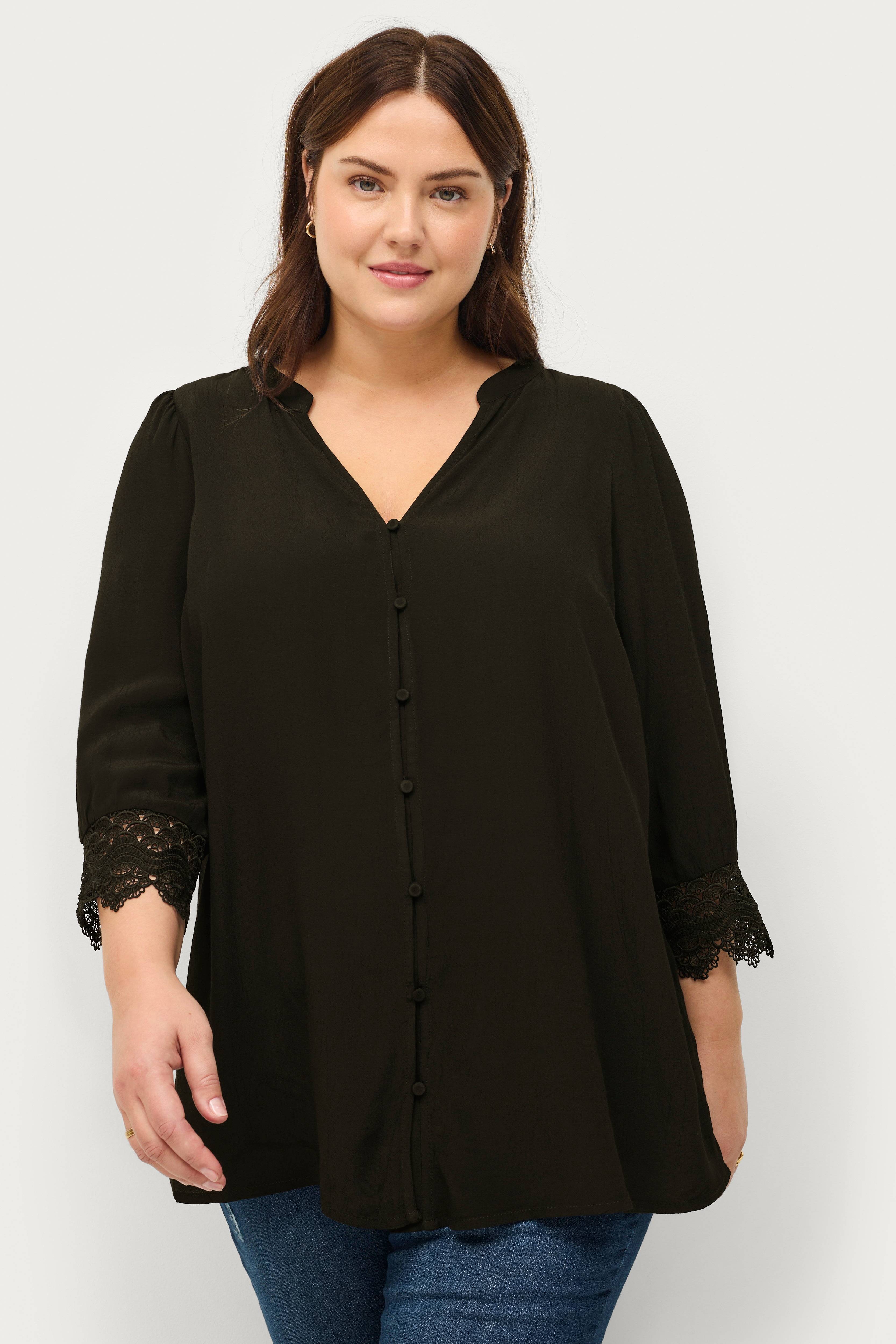 • Store størrelser• Lige model• V-udskæring foran• Løkkelukning med beklædte knapper• 3/4 langt ballonærme med blonde ved ærmeafslutningerne