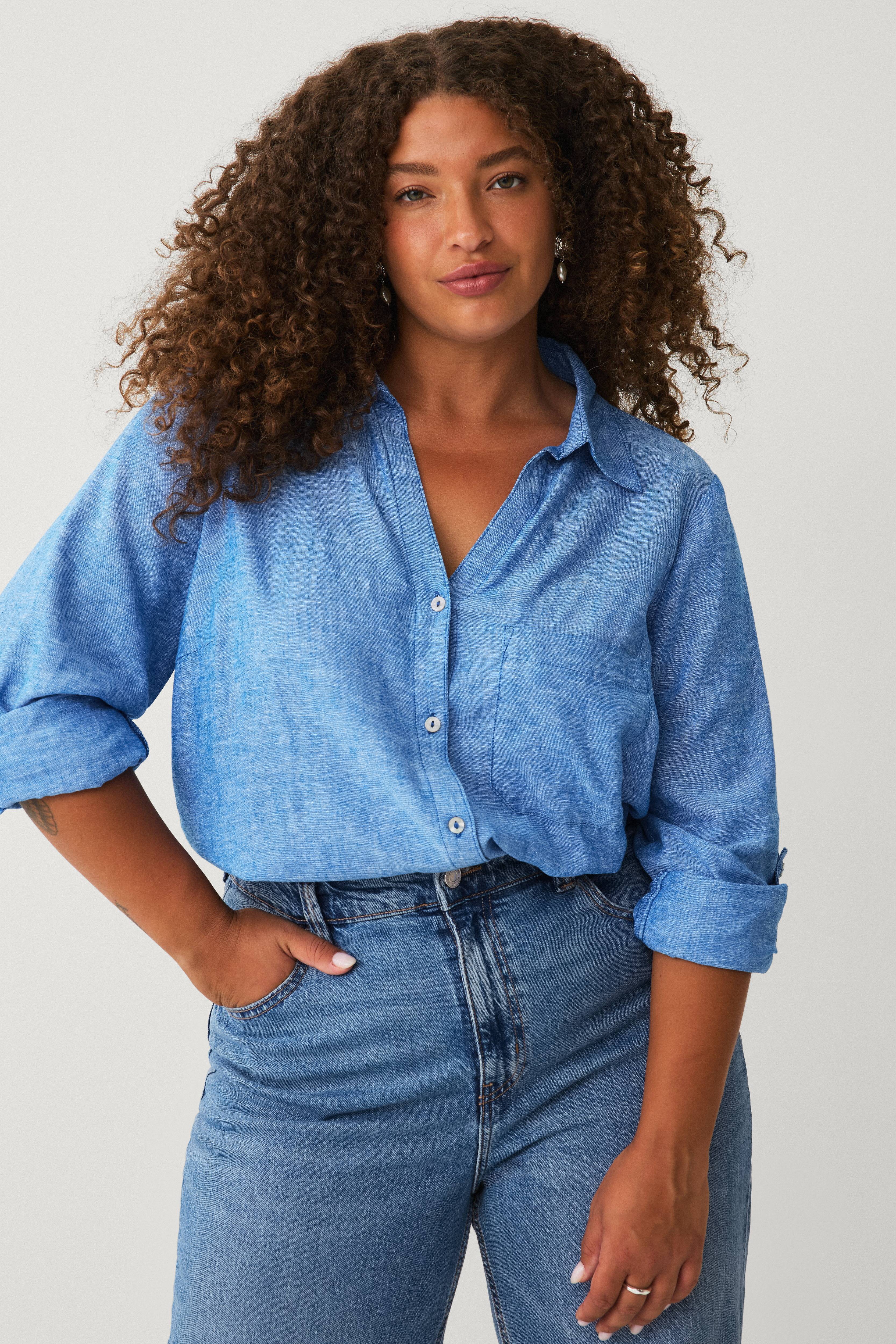 • Hørskjorte med v-udskæring• Afrundet søm• Brystlomme• Store størrelser•