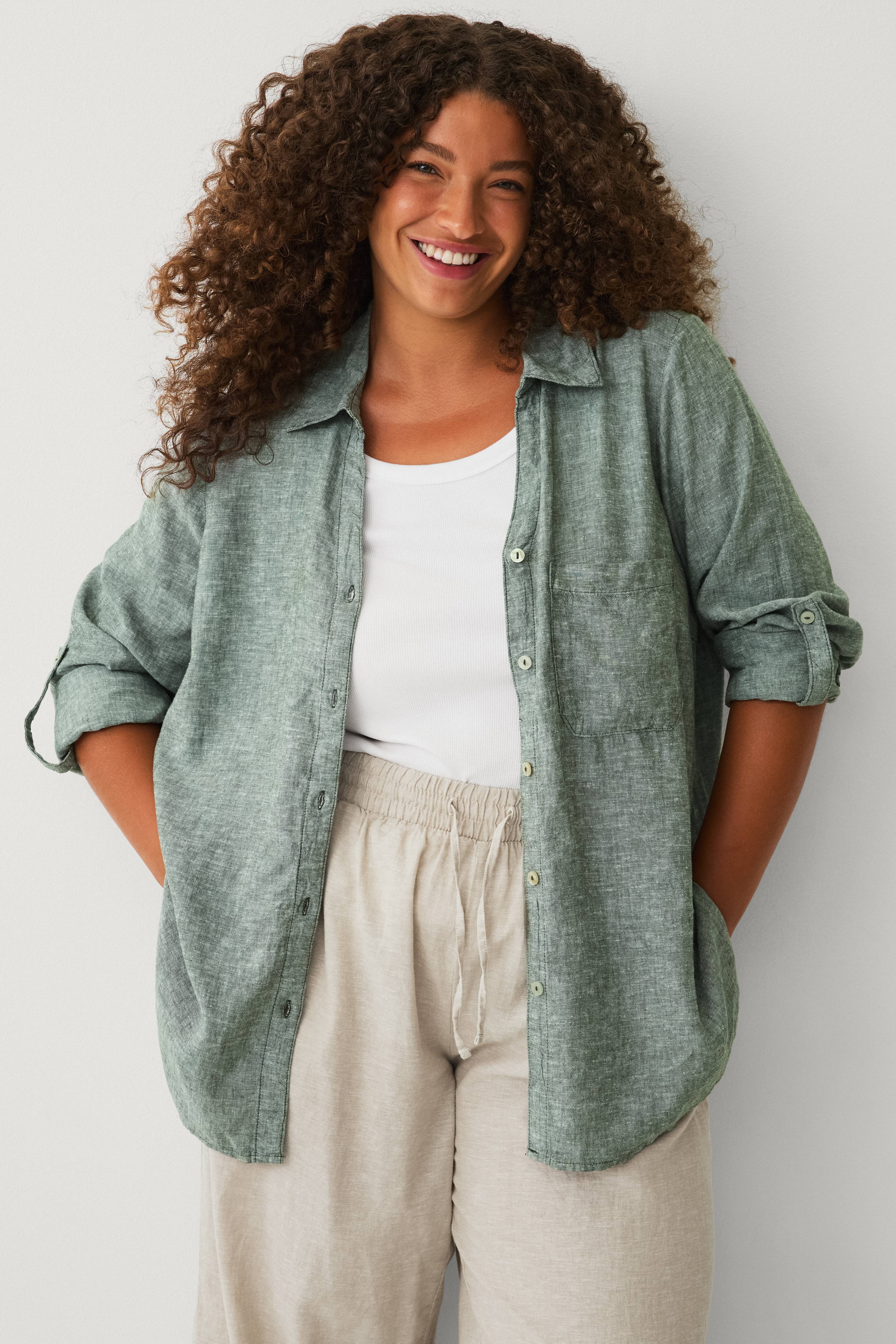 • Hørskjorte med v-udskæring• Afrundet søm• Brystlomme• Store størrelser•