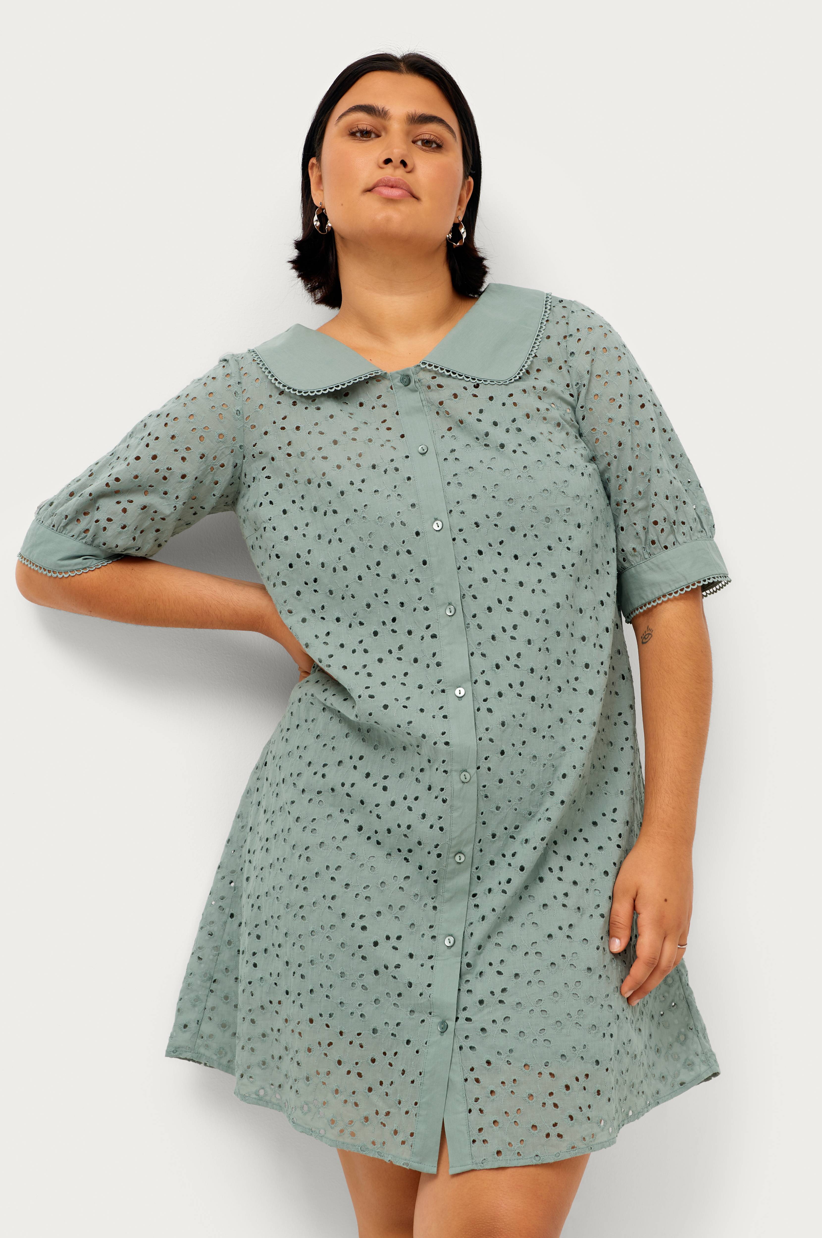 • Store størrelser• A-linje design• Knapper foran• Flæsekrave• Halvlange ærmer• Bomuldskvalitet med broderet hulmønster• Underkjole i jersey• Længde: 94 cm i størrelse S