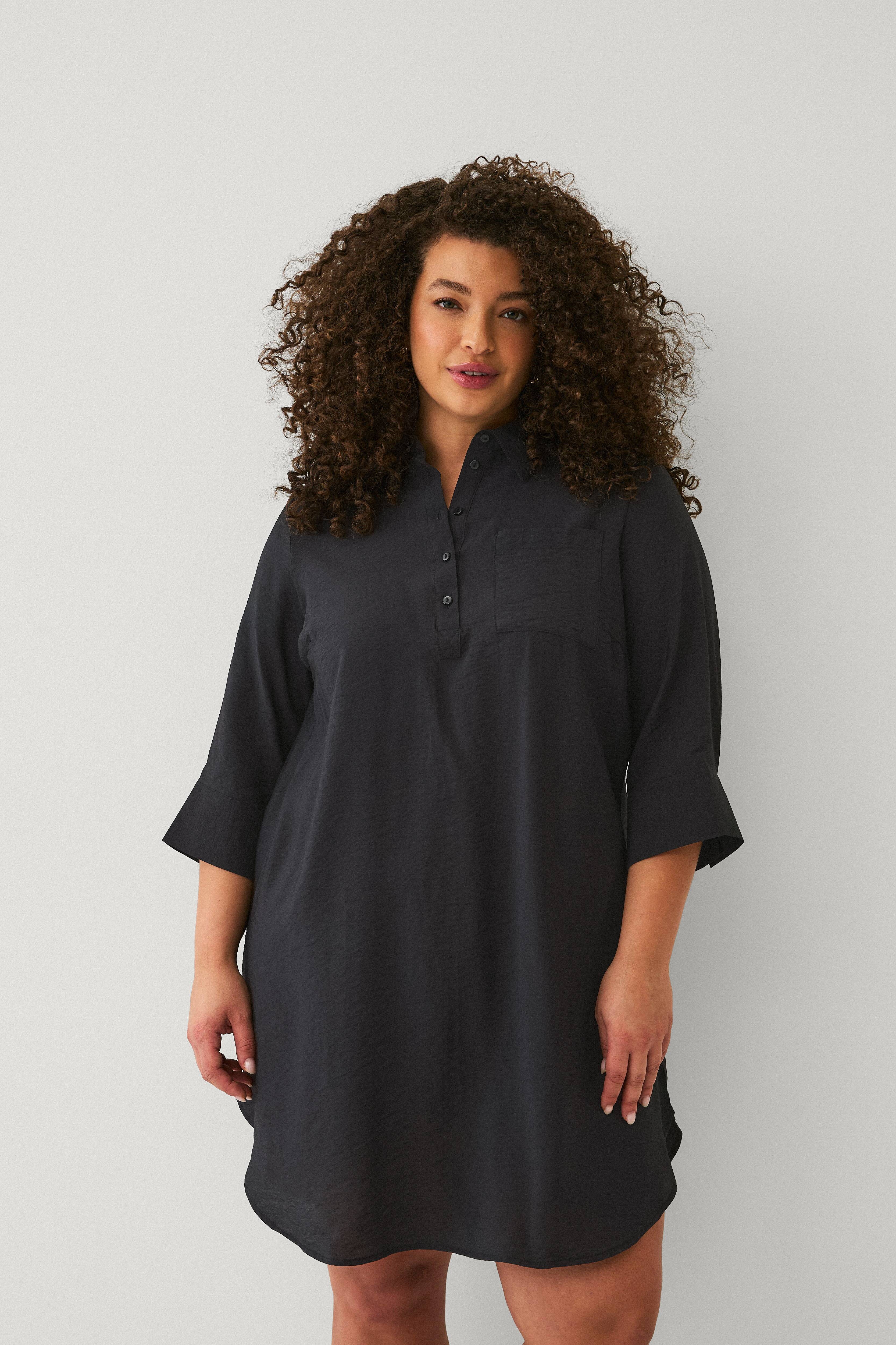 • Store størrelser• Model med svaj i crepe• Lille krave• Kort knaplukning foran• En brystlomme• Lige ærme med manchet• Afrundede slidser nede i siderne• Længde: 97 cm i størrelse S