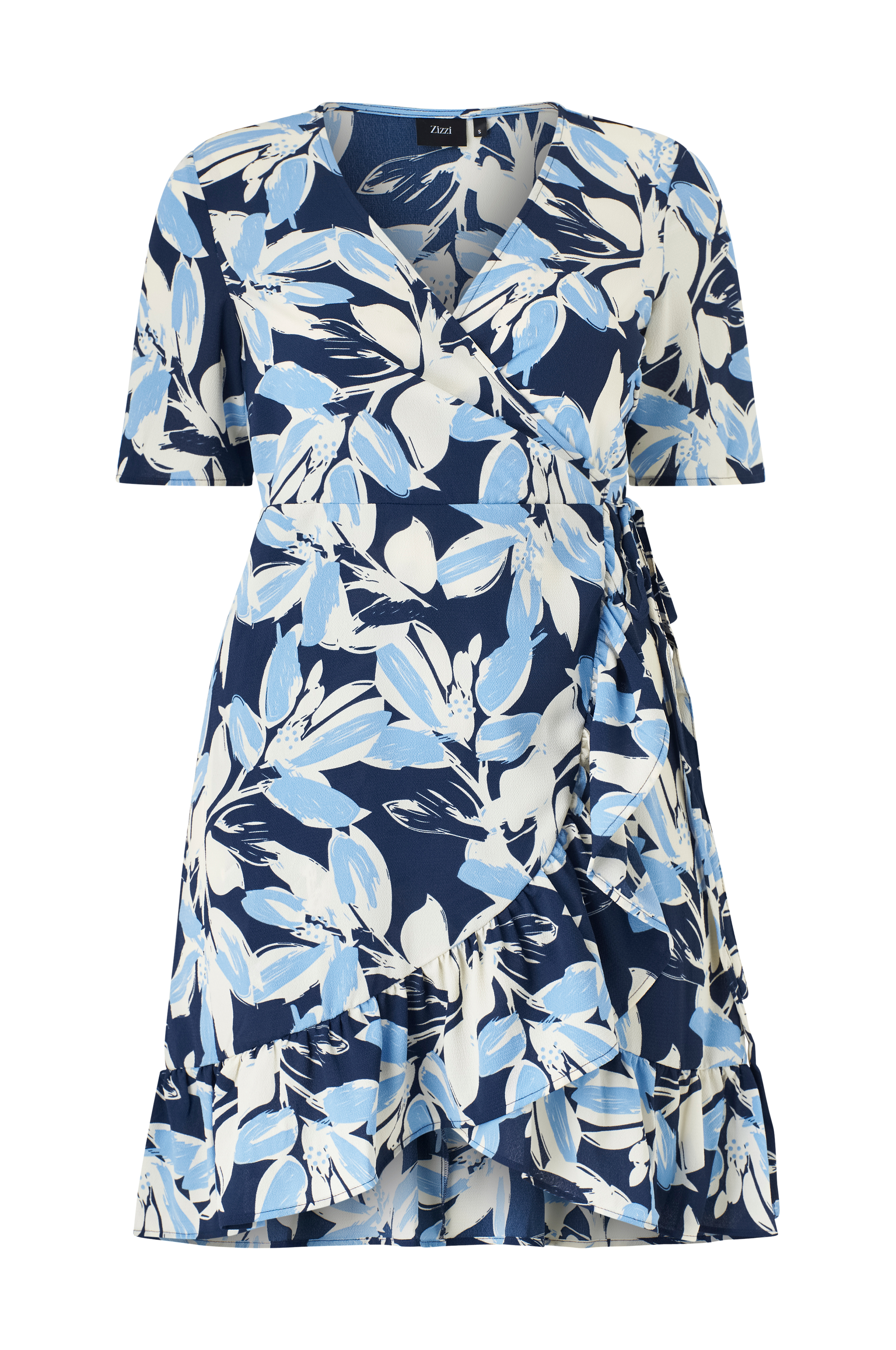 • Slå-om kjole med bindebånd i siden• Printet prikmønster• V-udskæring• Korte ærmer• Volanter foran og nederst• Store størrelser• Længde: 104 cm i størrelse S