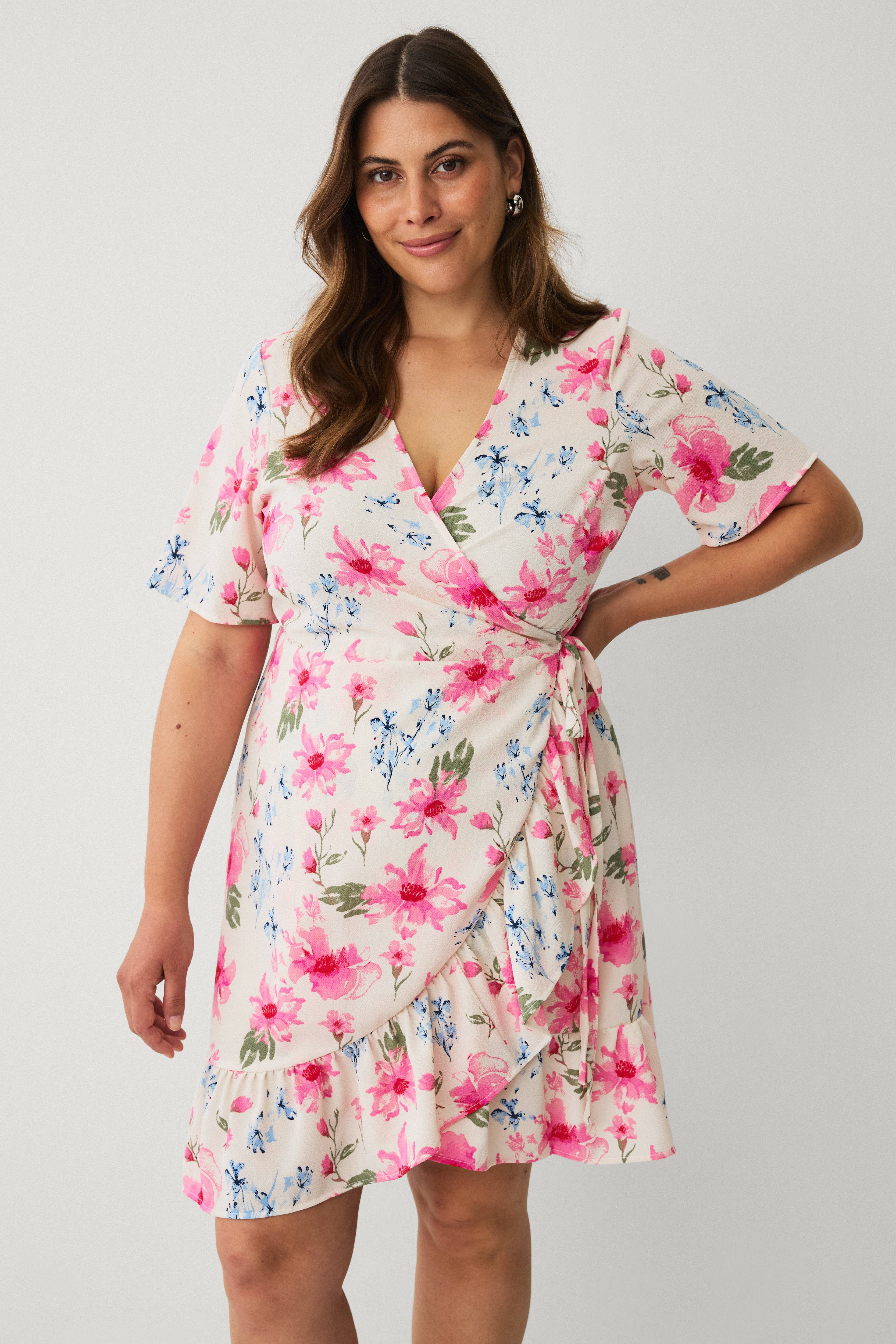 • Slå-om kjole med bindebånd i siden• Printet prikmønster• V-udskæring• Korte ærmer• Volanter foran og nederst• Store størrelser• Længde: 104 cm i størrelse S