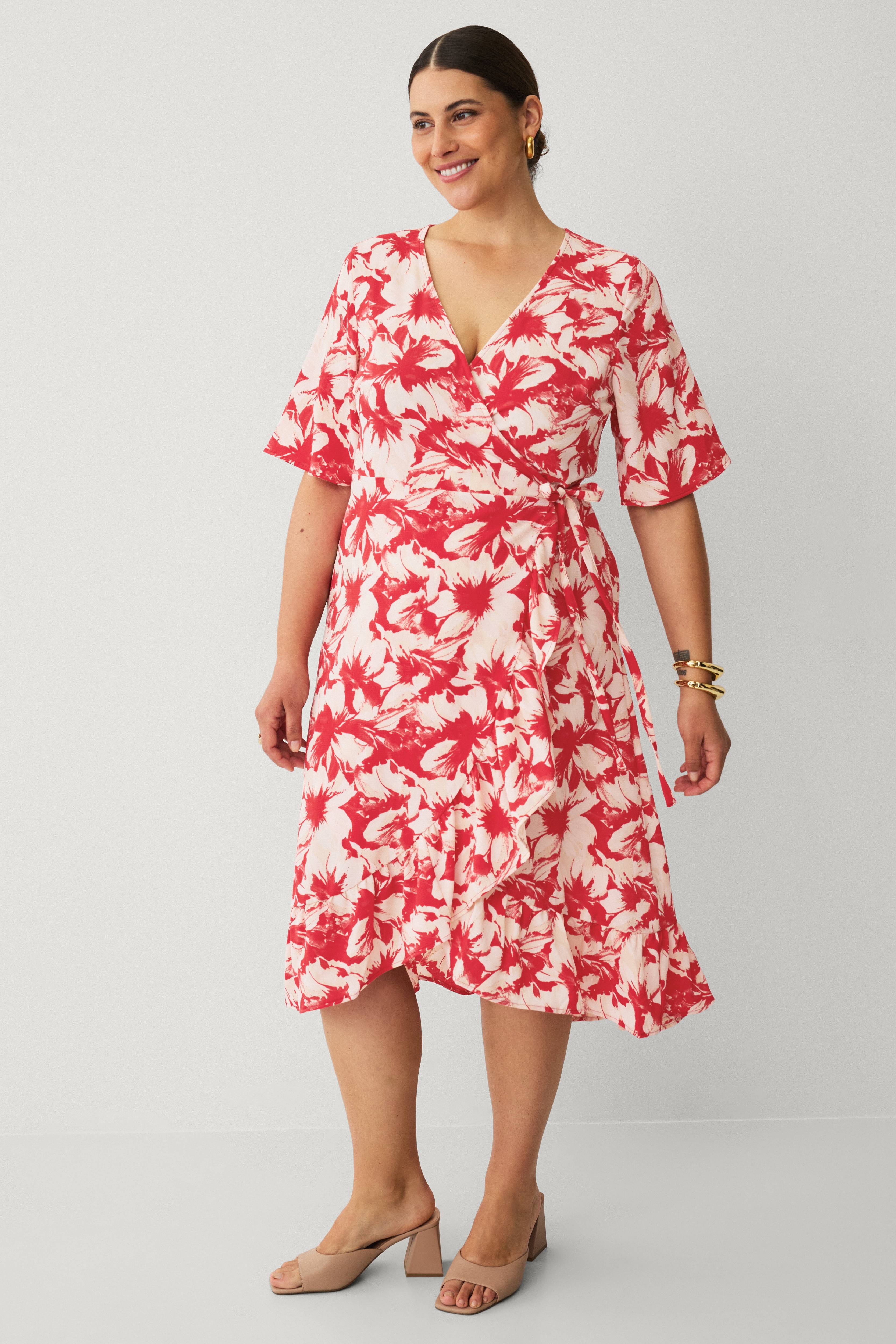 • Slå-om design• Snøring i siden• Halvlange ærmer• Volant nederst• Kreppet kvalitet• Store størrelser• Længde: 118 cm i størrelse S