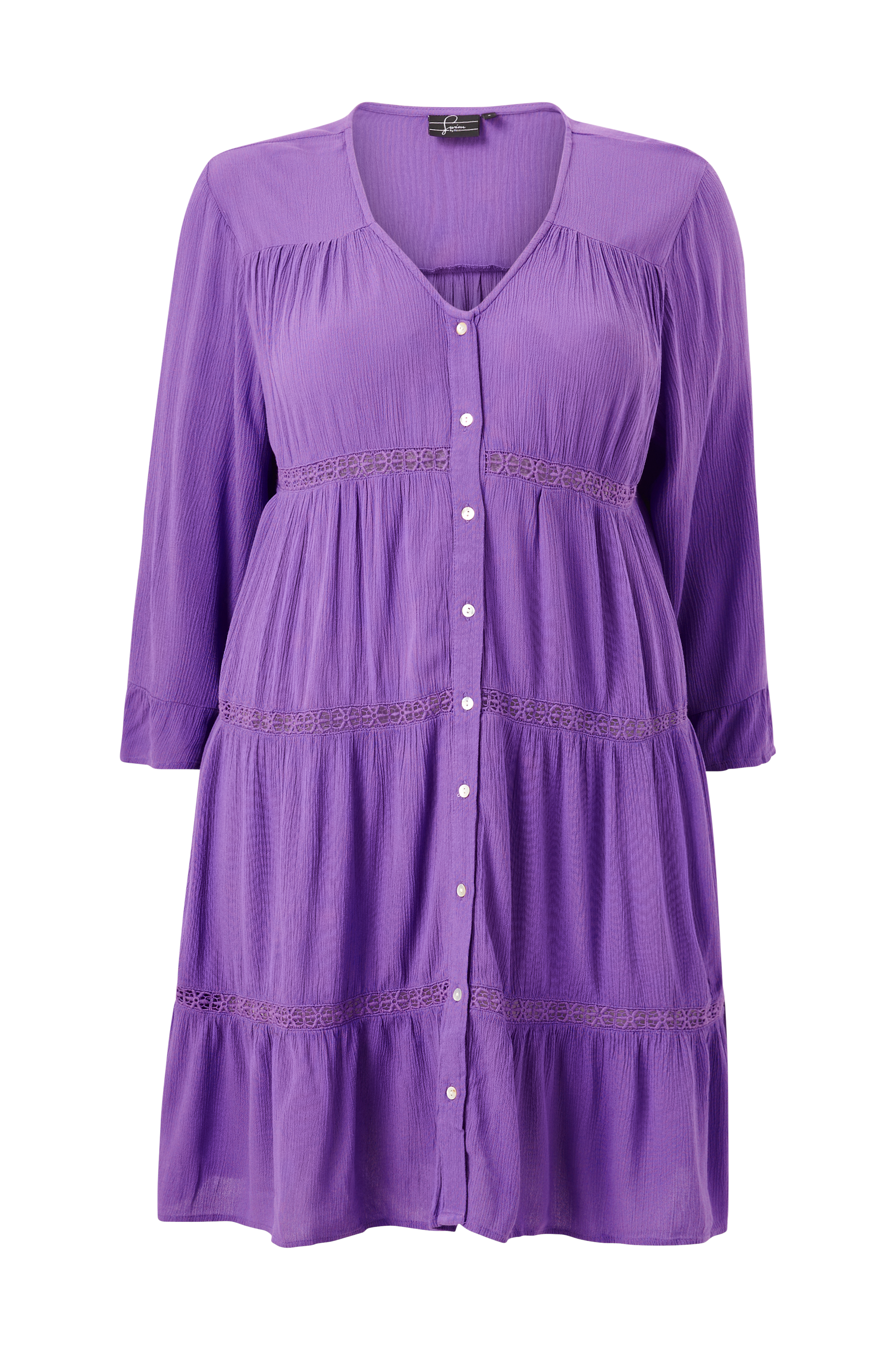 • Strandkjole i bomuld• Gennemknappet model• V-formet halsudskæring• Feminine blondedetaljer• Løst A-linje design• 3/4 lange ærmer• Store størrelser• Længde: 97 cm i størrelse S