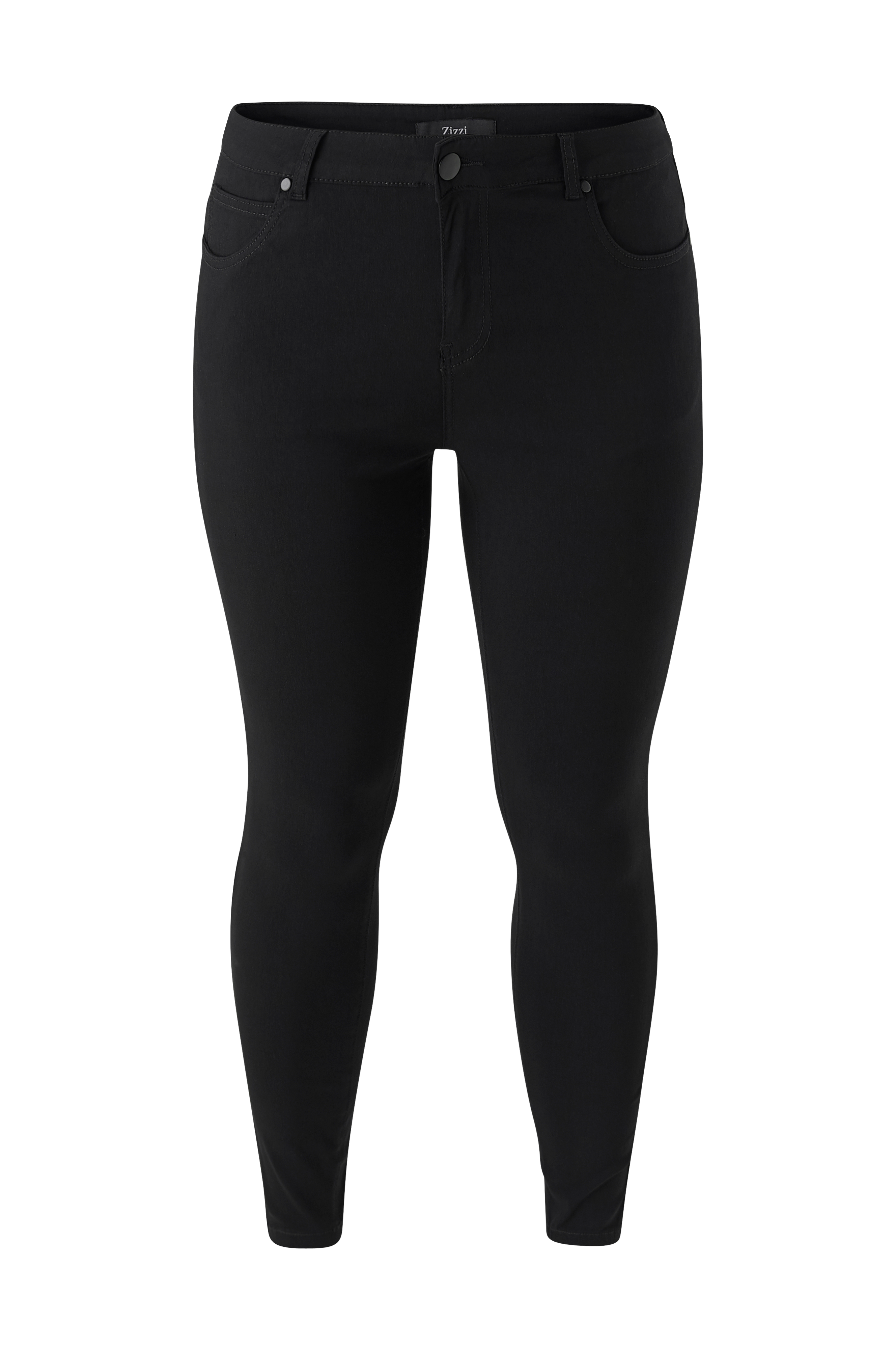 Stretchbukser fra Zizzi i smal model med fem lommer og lynlåsgylp. Vælg gerne en størrelse mindre end du normalt bruger. Indvendig benlængde ca. 79 cm i str. 44.