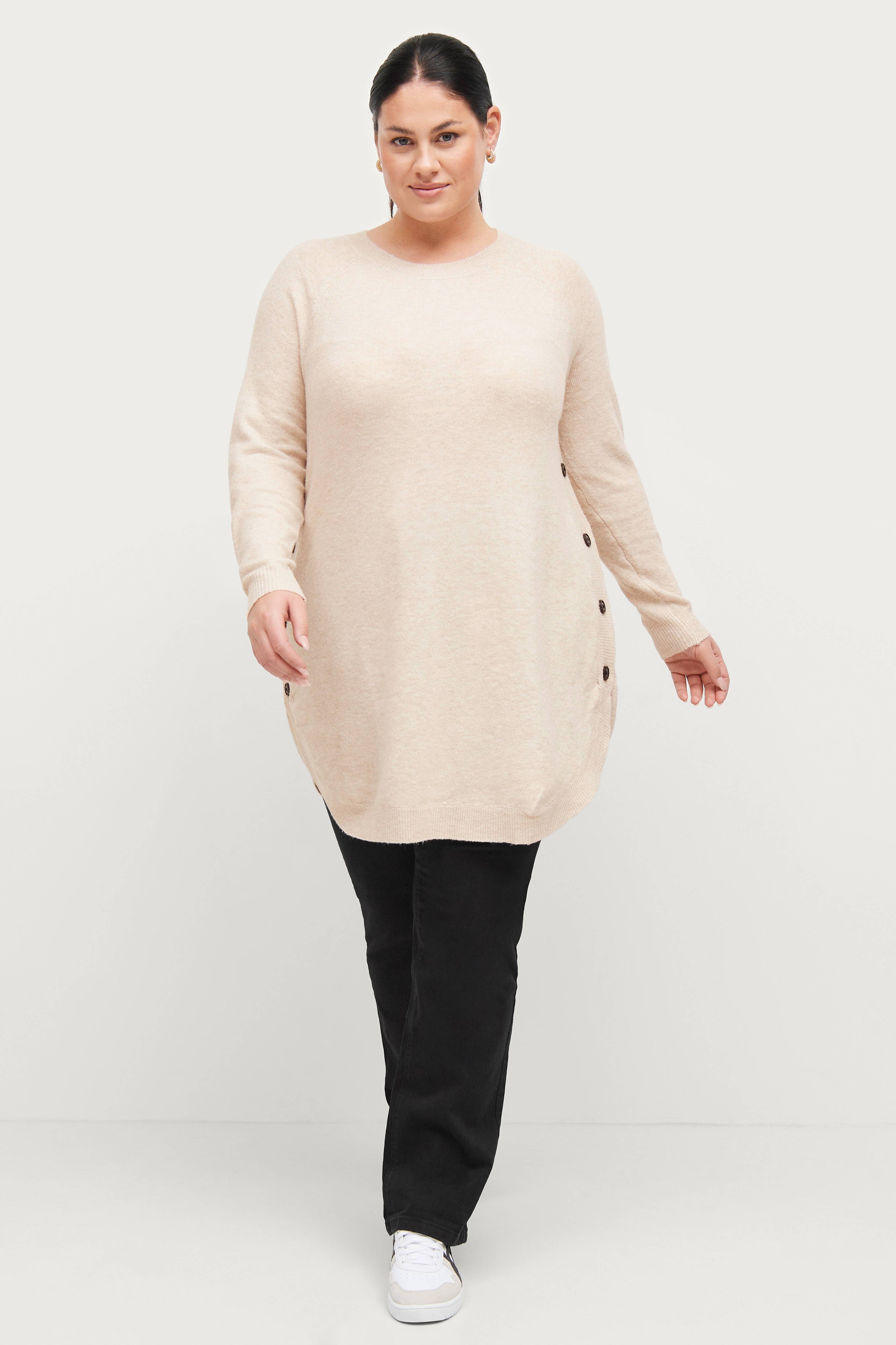• Dekorative knapper i siderne• Ribstrikkede ærmeafslutninger• Afrundet søm• Bred, ribstrikket halsudskæring• Store størrelser• Længde: 93 cm i størrelse S