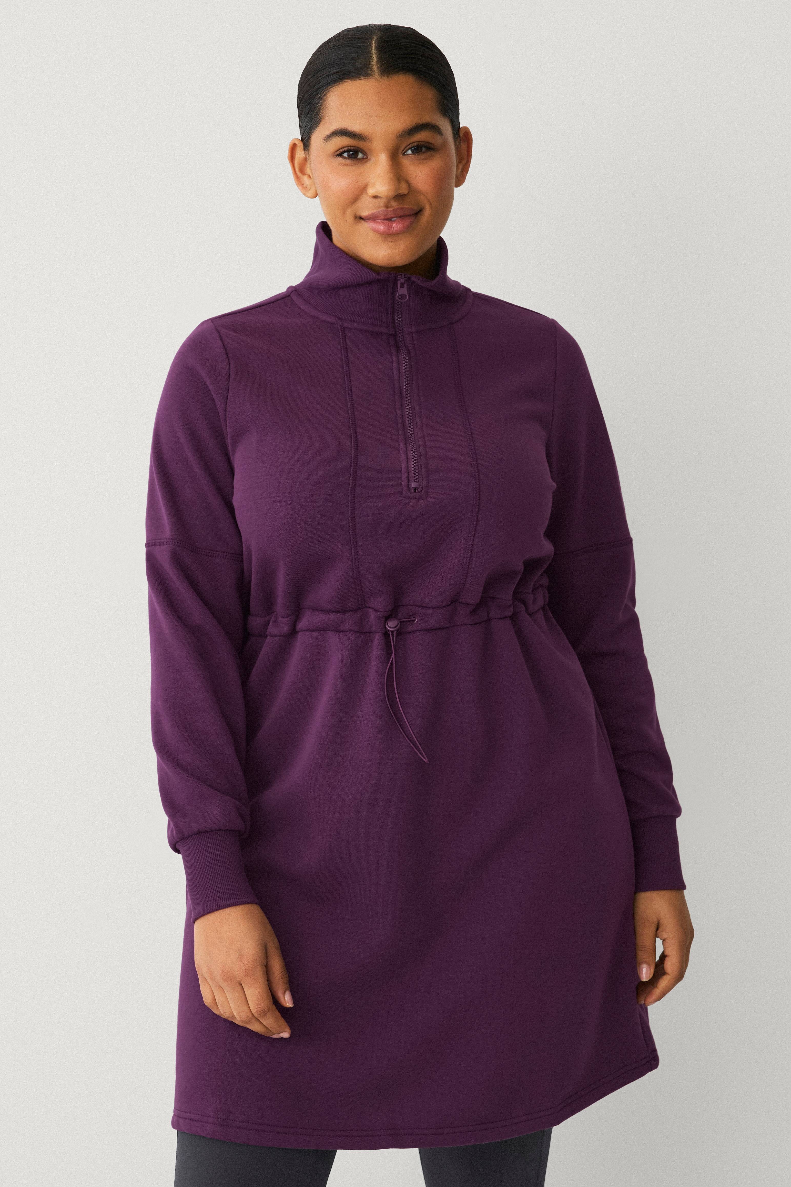 • Kort sweatshirtkjole med blød, børstet inderside • Høj, ribbet halsudskæring • Kort lynlås • Træksnørre ved taljen • Ribmanchetter ved manchetterne • Store størrelser • Længde: 96 cm i størrelse S