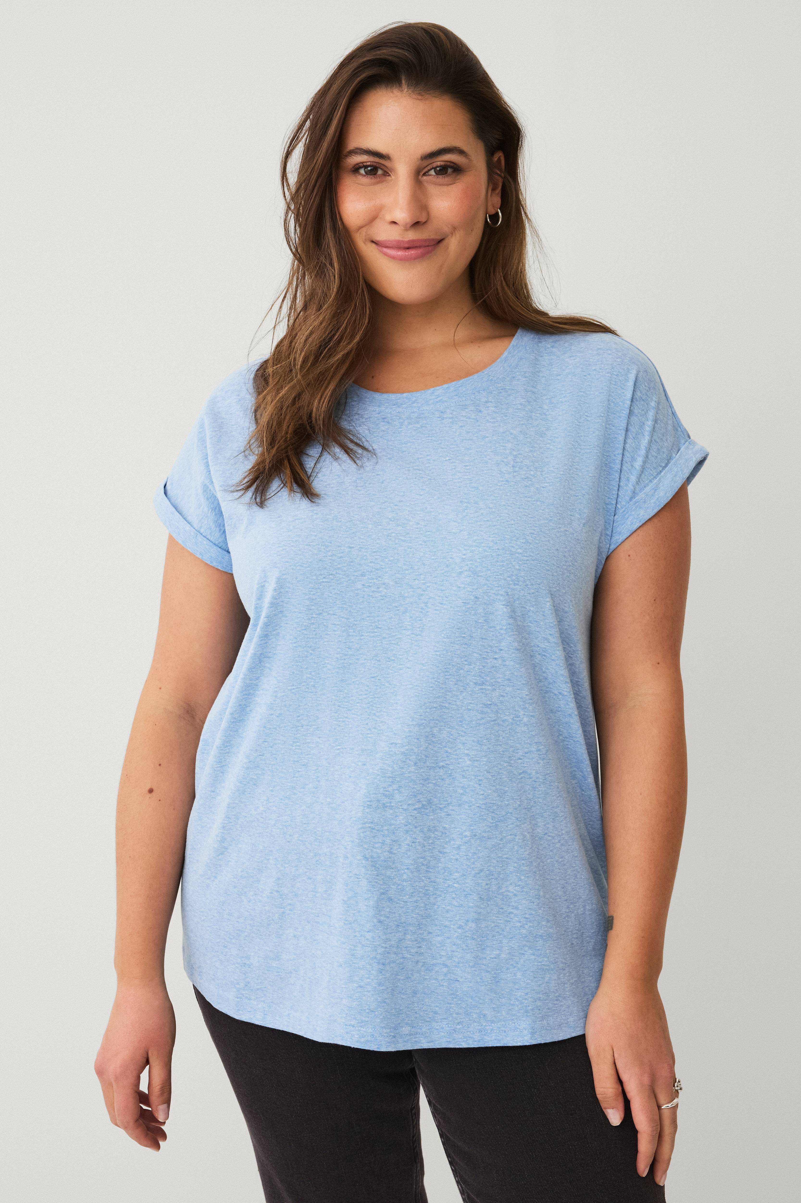 • Korte ærmer med oprullet• Løs pasform• Rund hals• Store størrelser