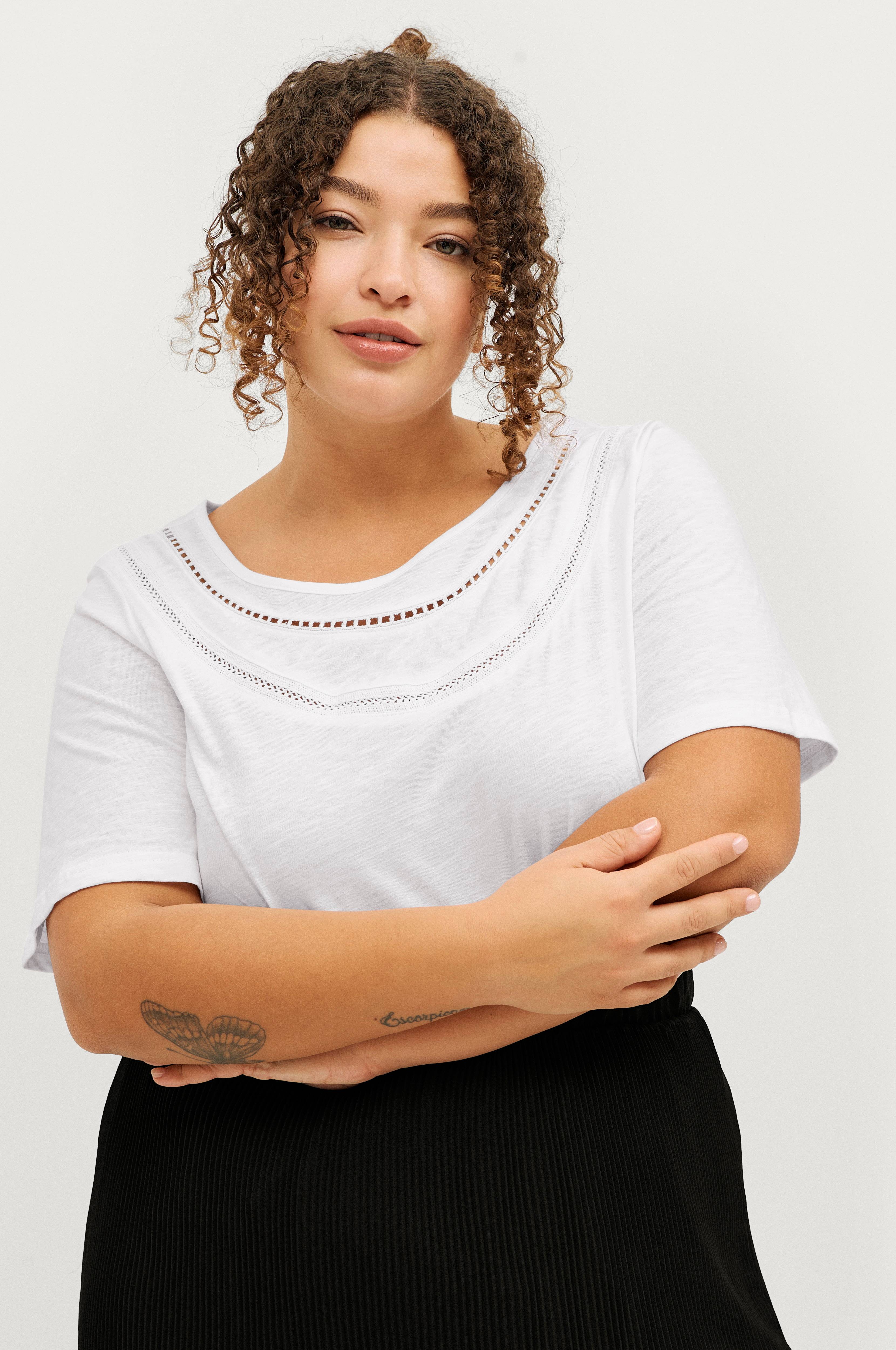 • Løs pasform• Rund halsudskæring• Blondedetaljer oppe foran med hulmønster• Store størrelser