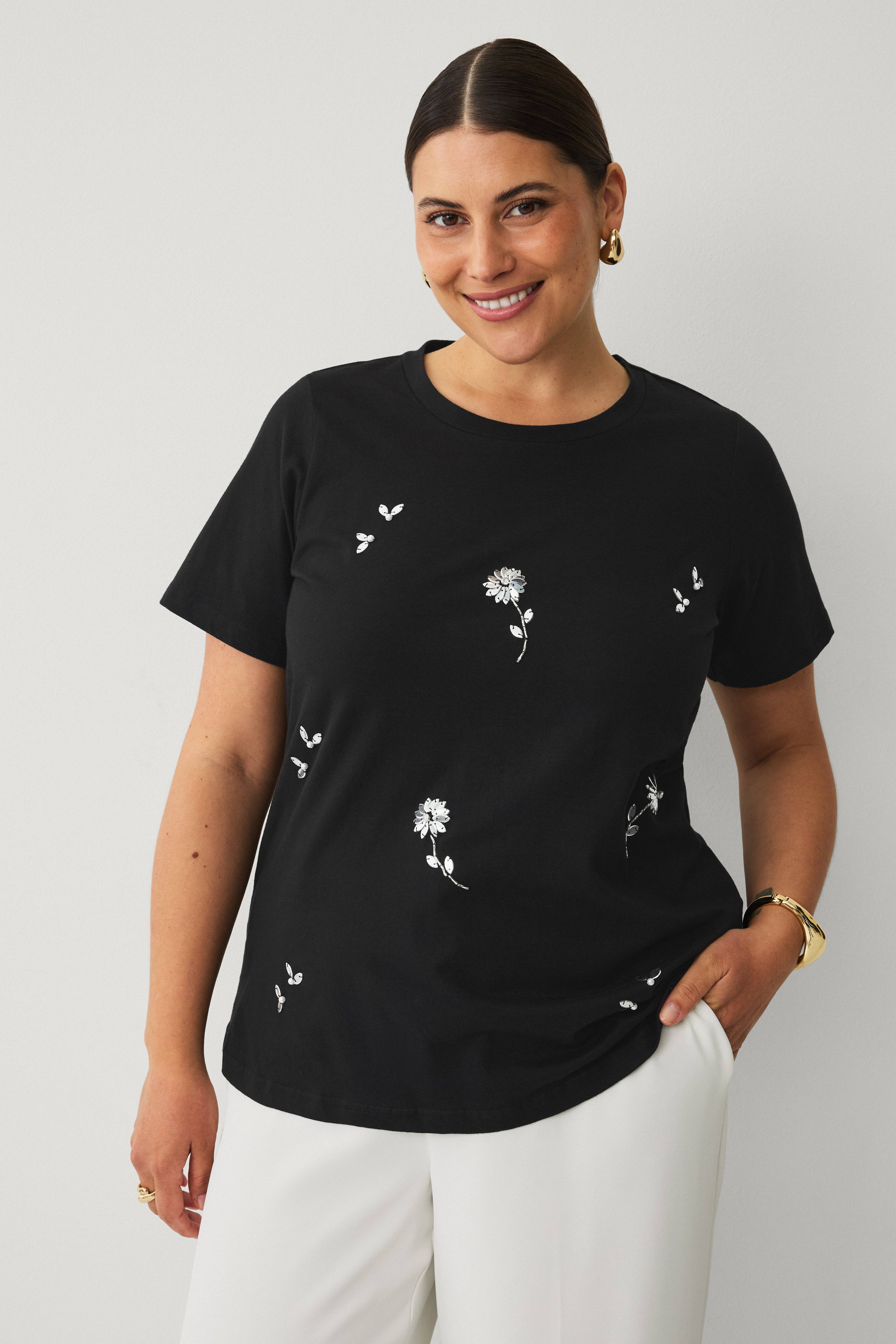• T-shirt med rund halsudskæring• Påsyede, sølvagtige pailleter foran• Store størrelser