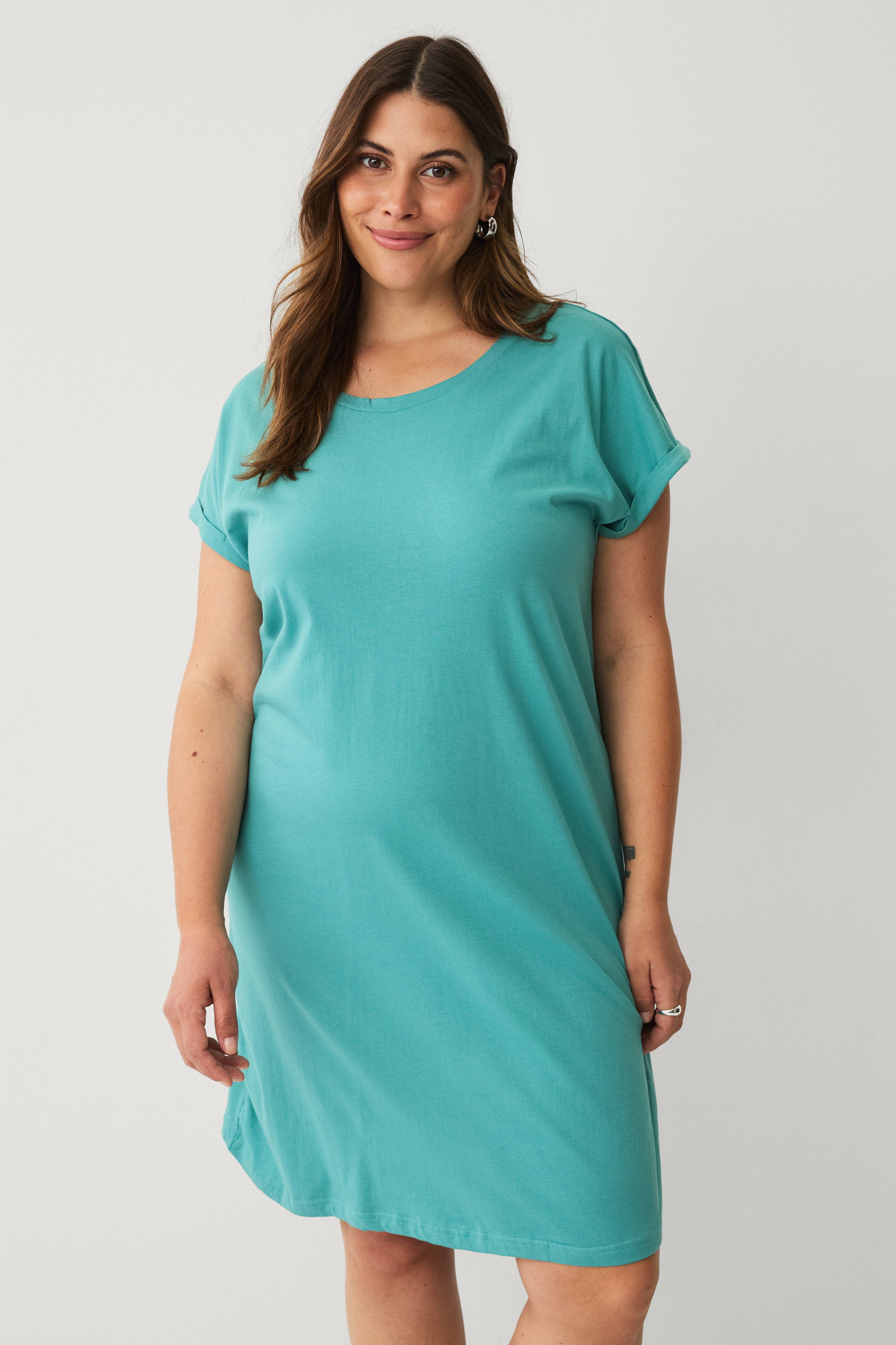 • 2-pak med t-shirtkjoler• Blødt materiale i bomuld• Afslappet pasform• Rund halsudskæring• Korte, foldede ærmer• Store størrelser• Længde: 99 cm i størrelse S