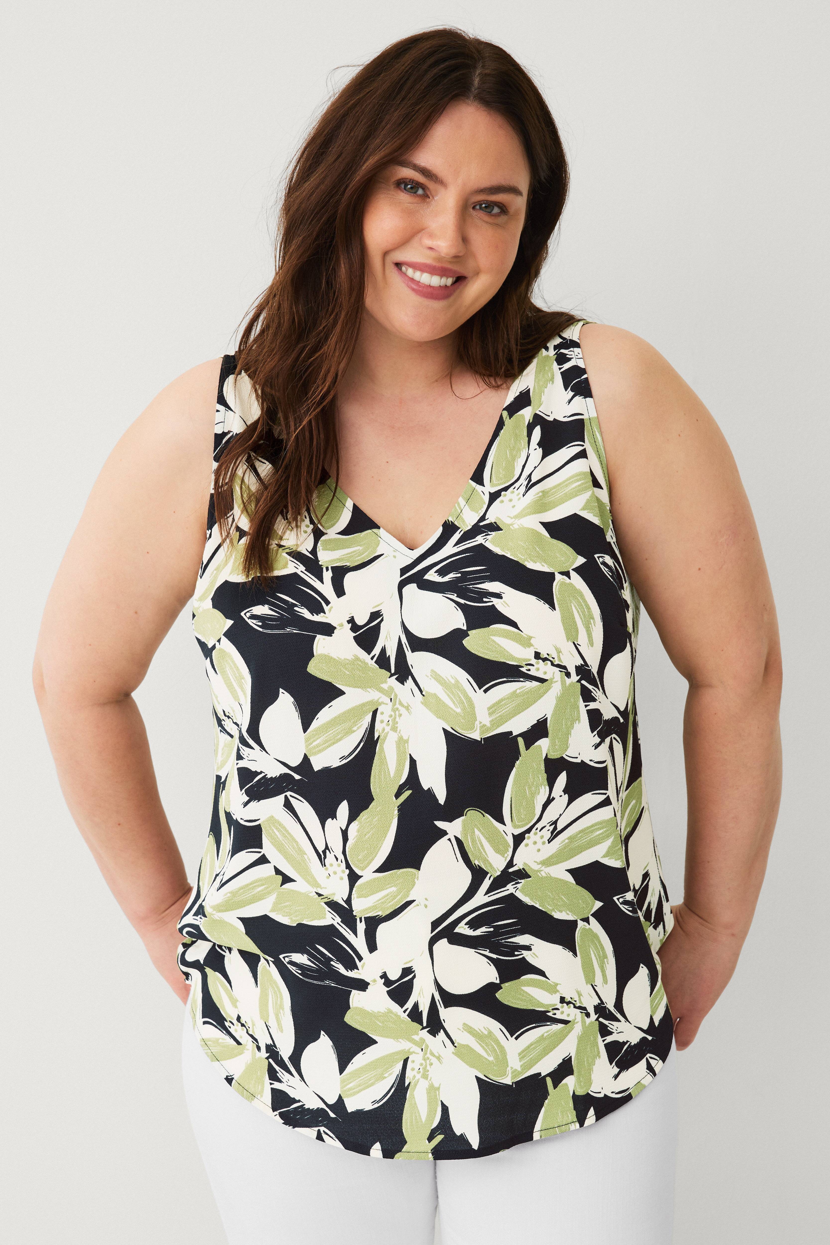 • Ærmeløs, mønstret top med struktur i stoffet• V-formet halsudskæring• Afrundet søm• Store størrelser