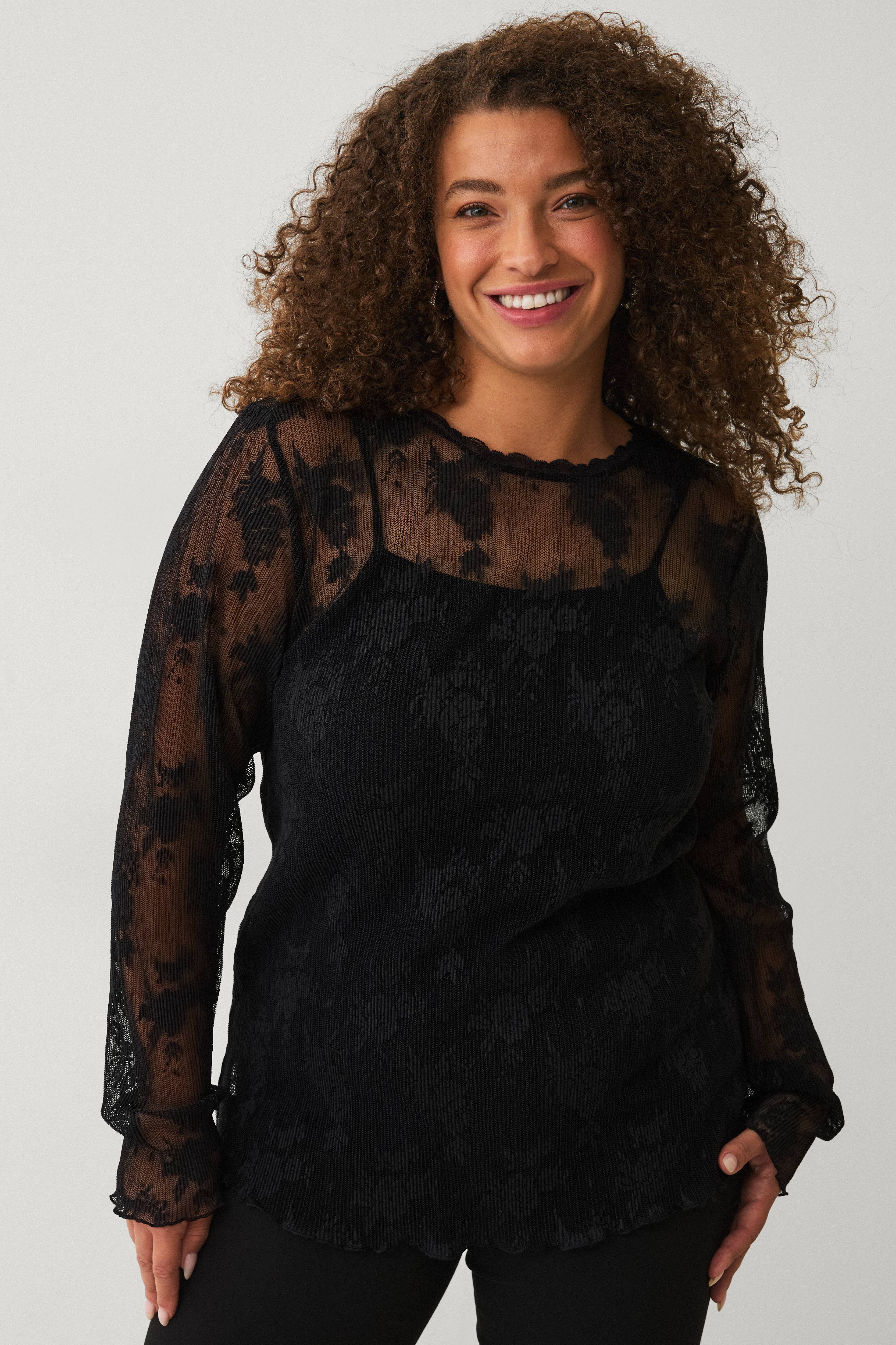 • Transparent, langærmet top i blonde• Rund halsudskæring med blondekant• Nøglehulsåbning med dekorativ knap i nakken• Bølgede kanter ved ærmeafslutningerne og ved nederste kant• Plusstørrelser