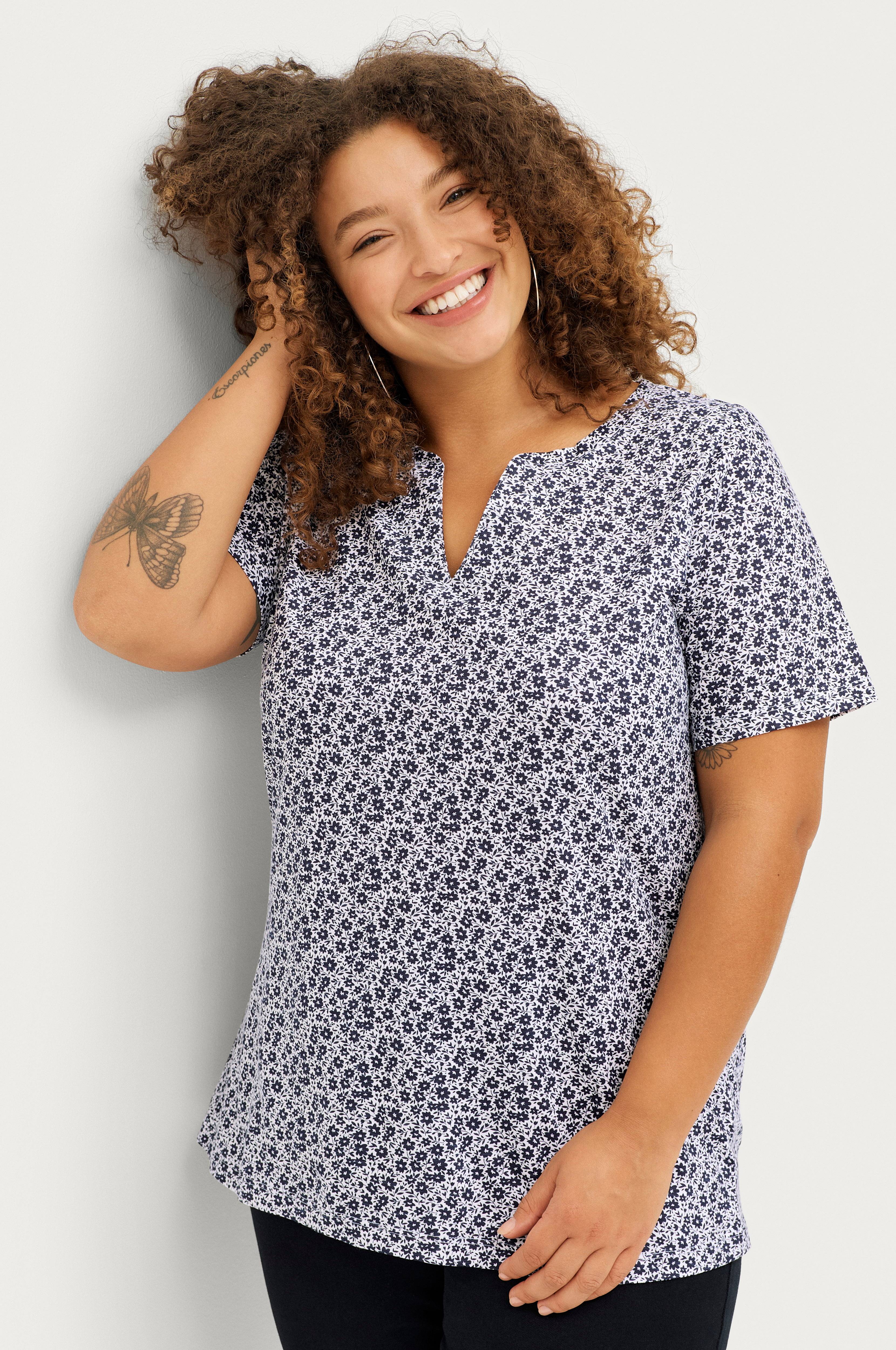 • Lige pasform• V-formet halsudskæring• Korte ærmer• Store størrelser
