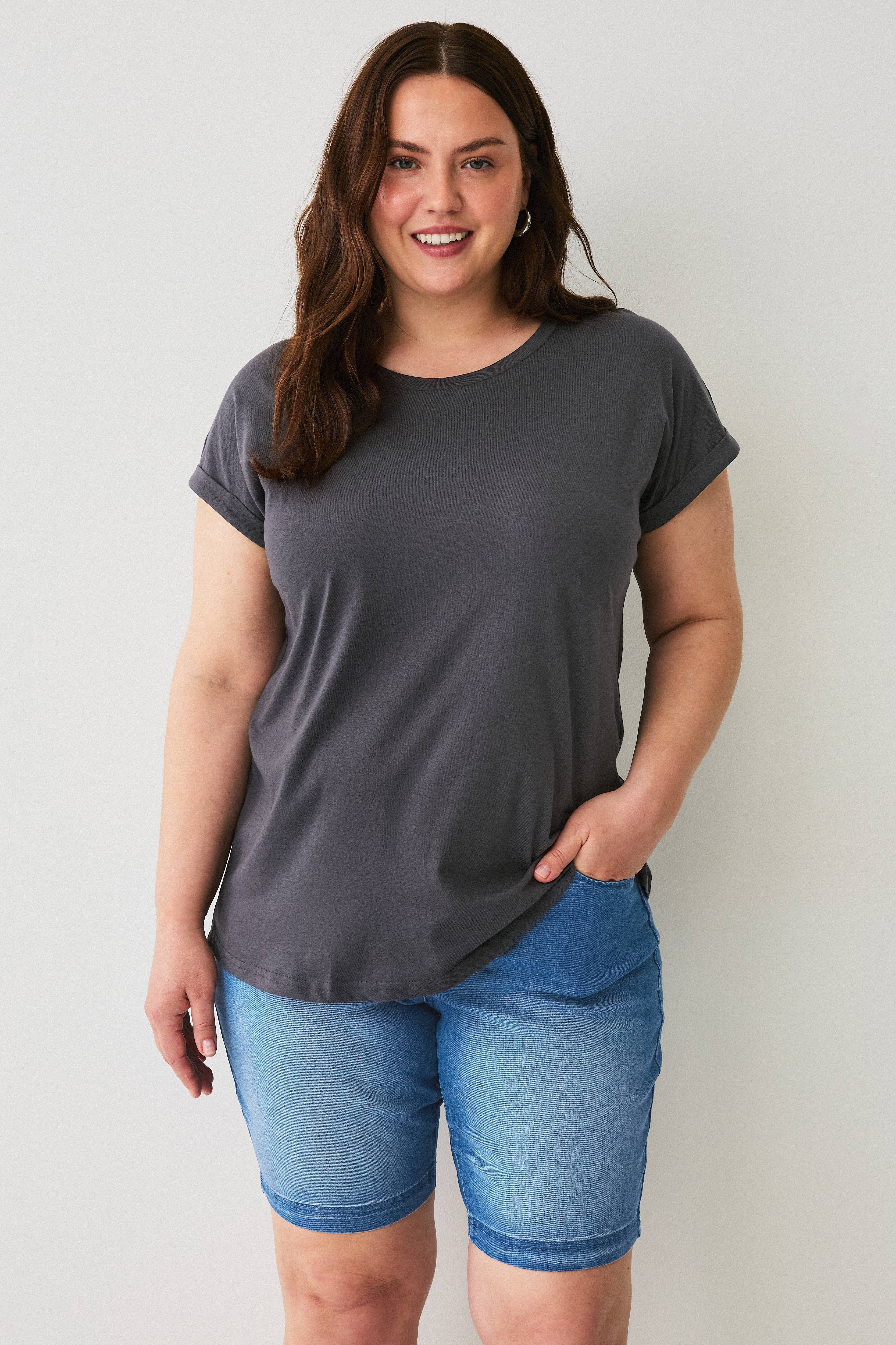 • Kort ærme med oprullet• Rund halsudskæring• Løs pasform• Store størrelser