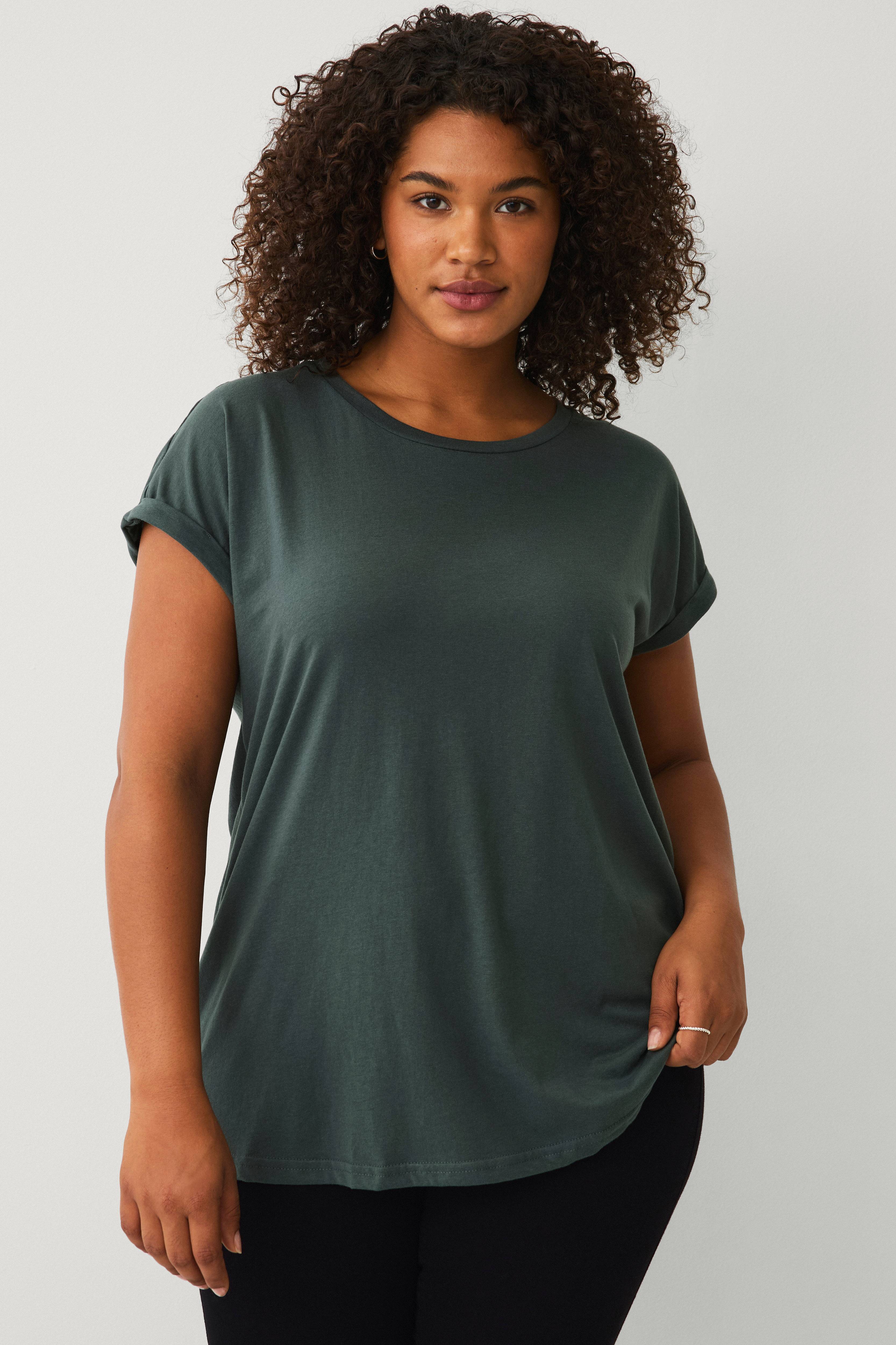 • Kort ærme med oprullet• Rund halsudskæring• Løs pasform• Store størrelser
