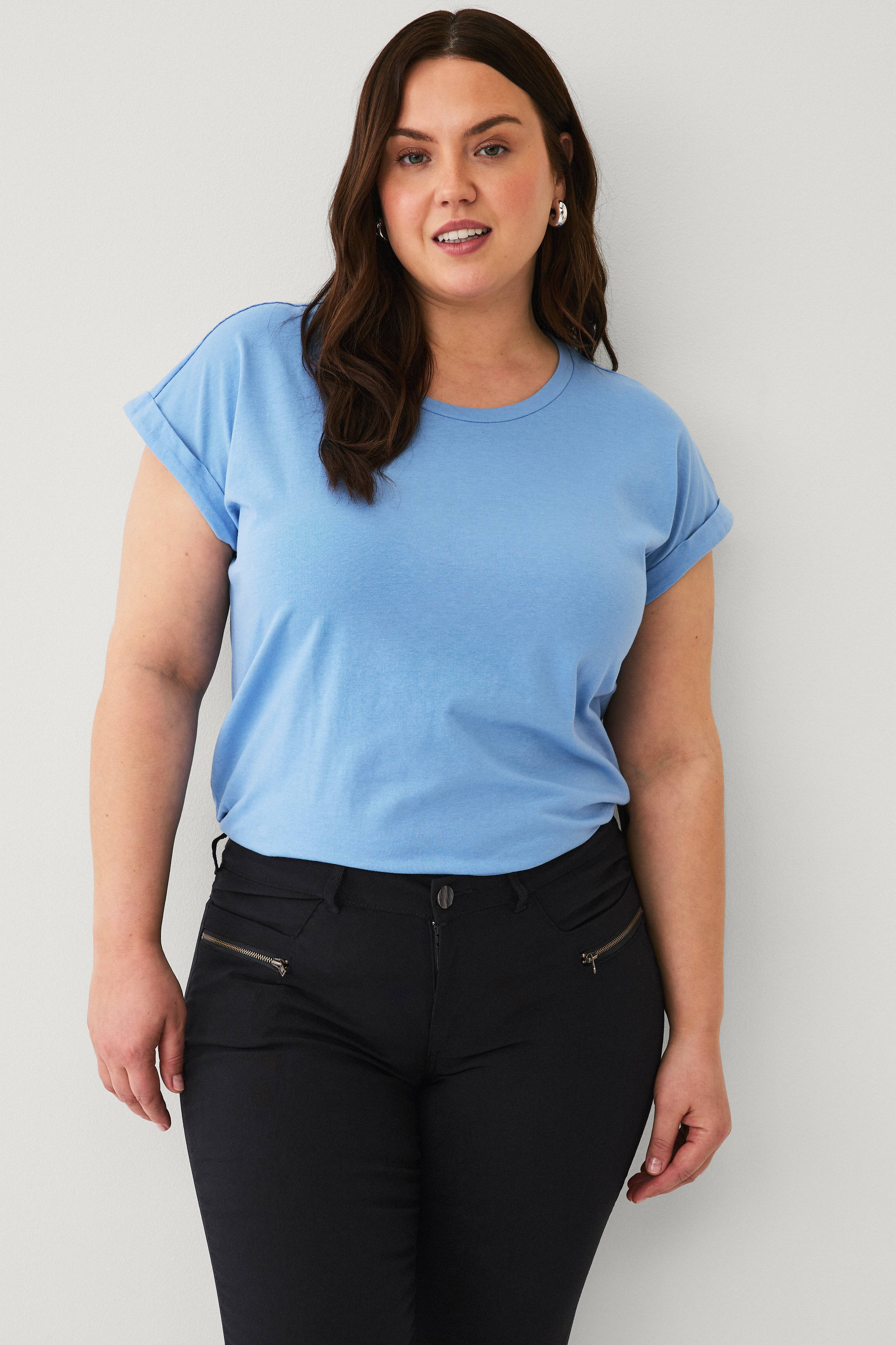 • Kort ærme med oprullet• Rund halsudskæring• Løs pasform• Store størrelser