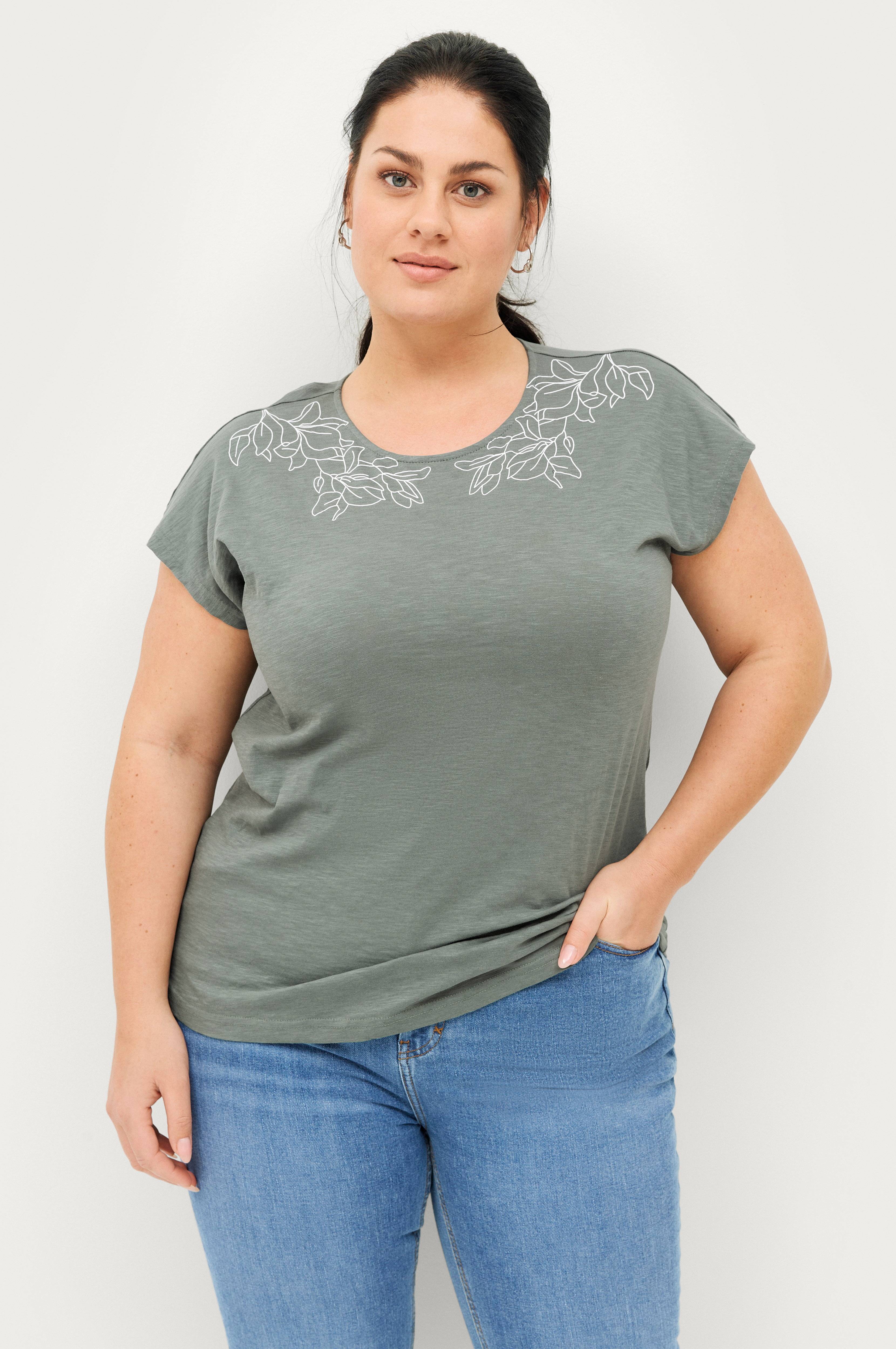 • Top i bomuld• Rund halsudskæring• Tryk foran• Løs pasform• Store størrelser