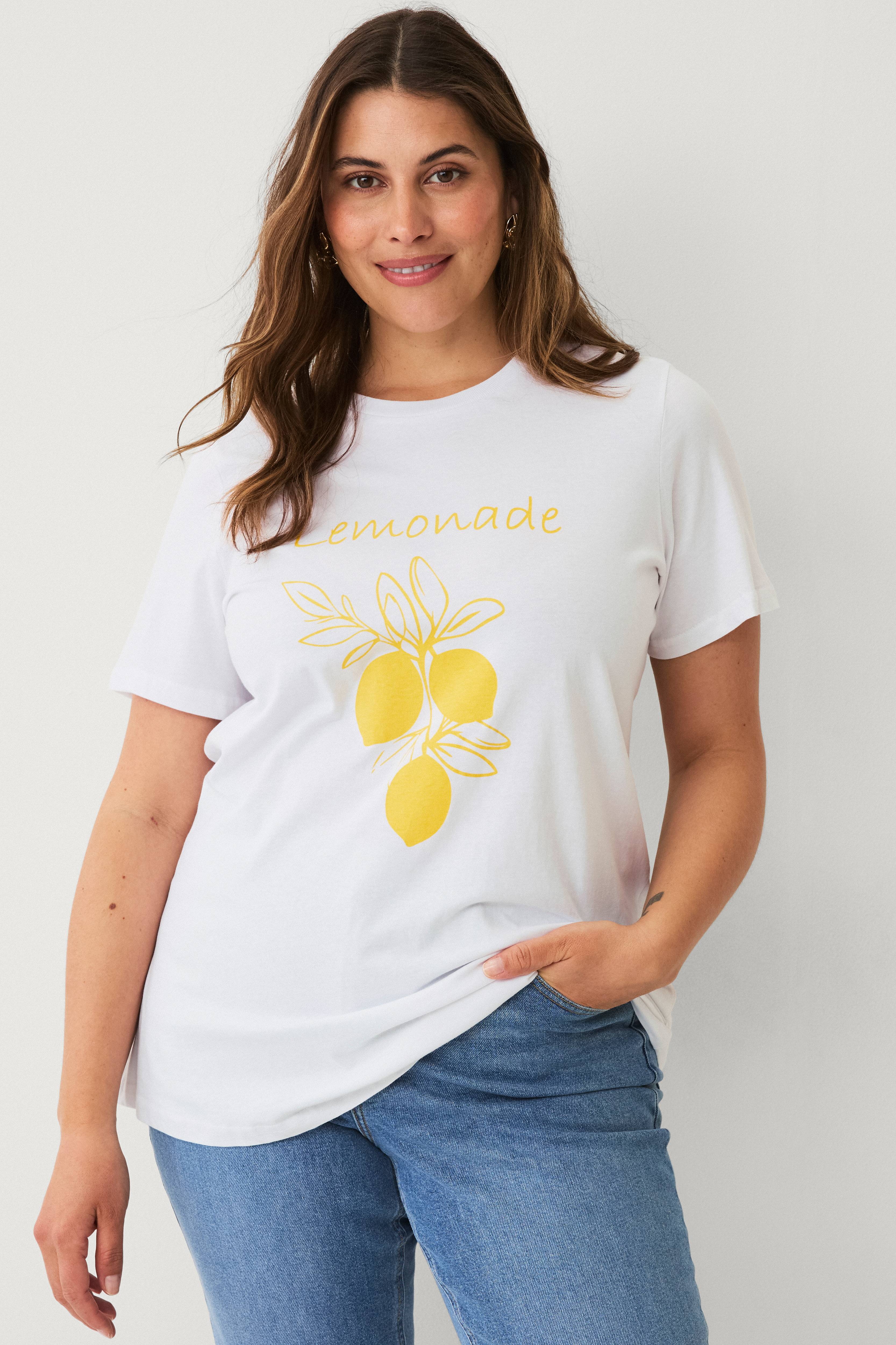 • Store størrelser• Lige model• Tryk foran• Kort ærme• Rund halsringning