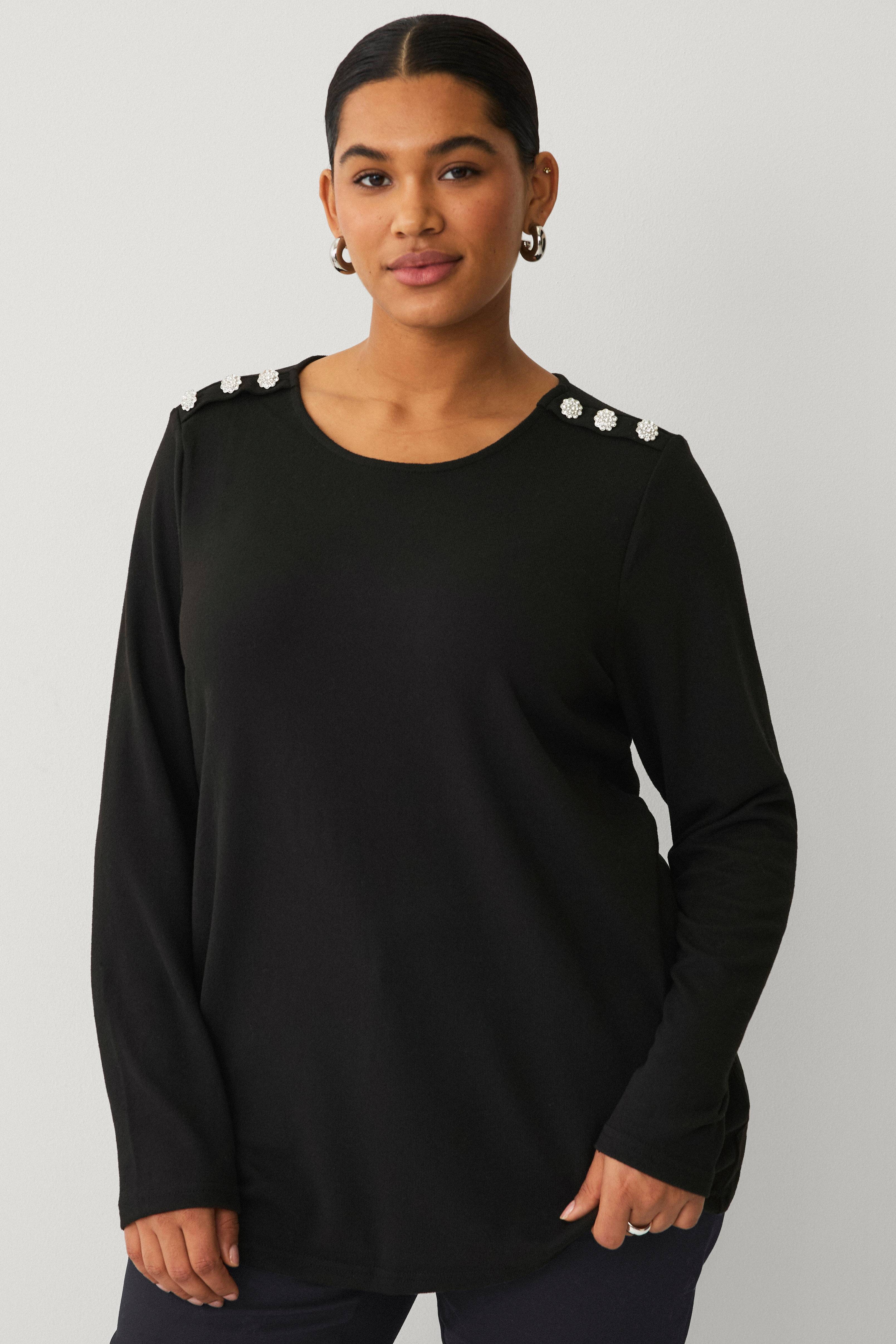• Langærmet top med dekorative knapper på skuldrene• Rund halsudskæring• Normal pasform• Store størrelser