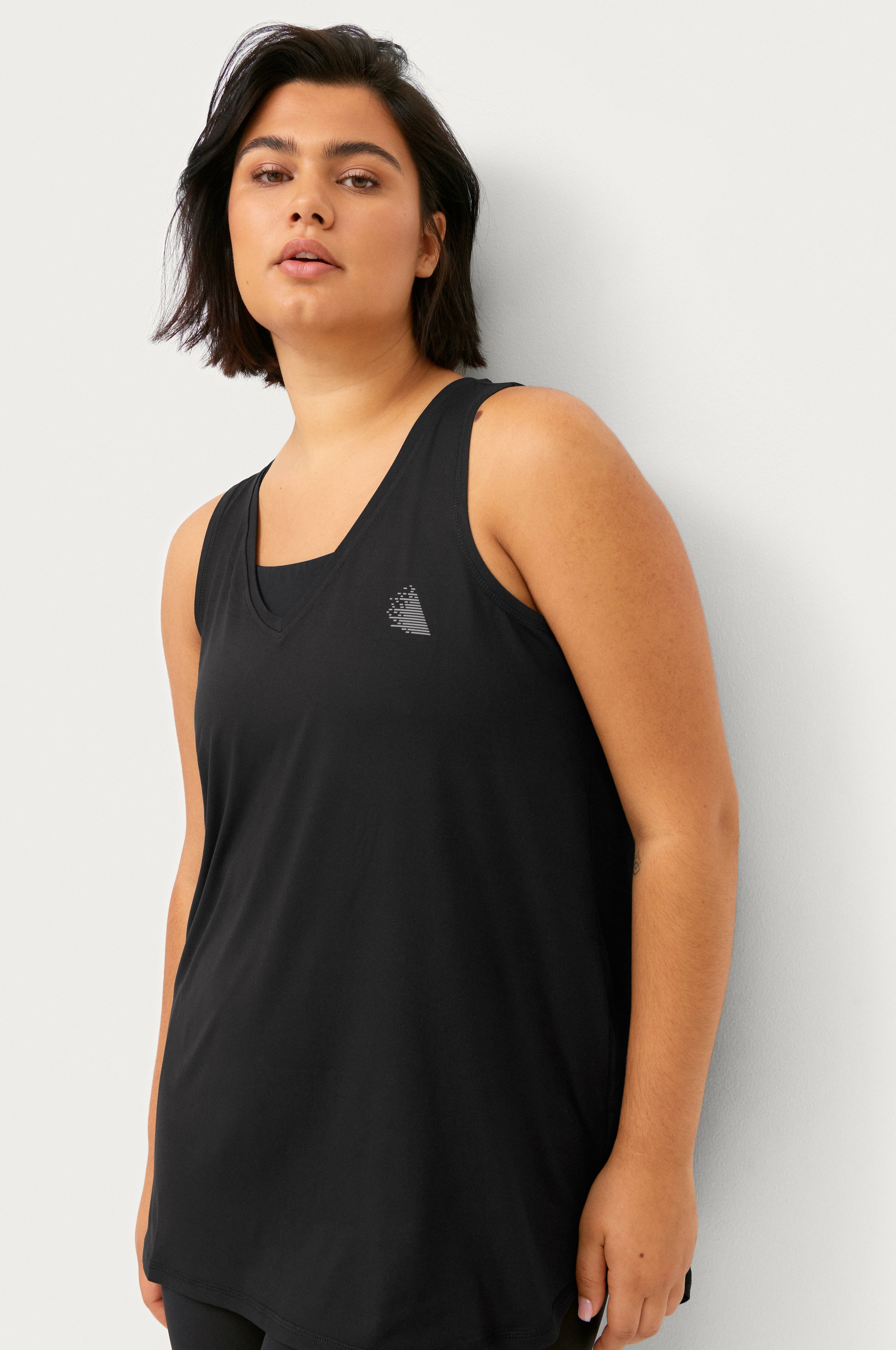 • Store størrelser• Ærmeløs model• V-udskæring• Lille tryk på brystet• Blødt, fugttransporterende funktionelt materiale med åndbarhed