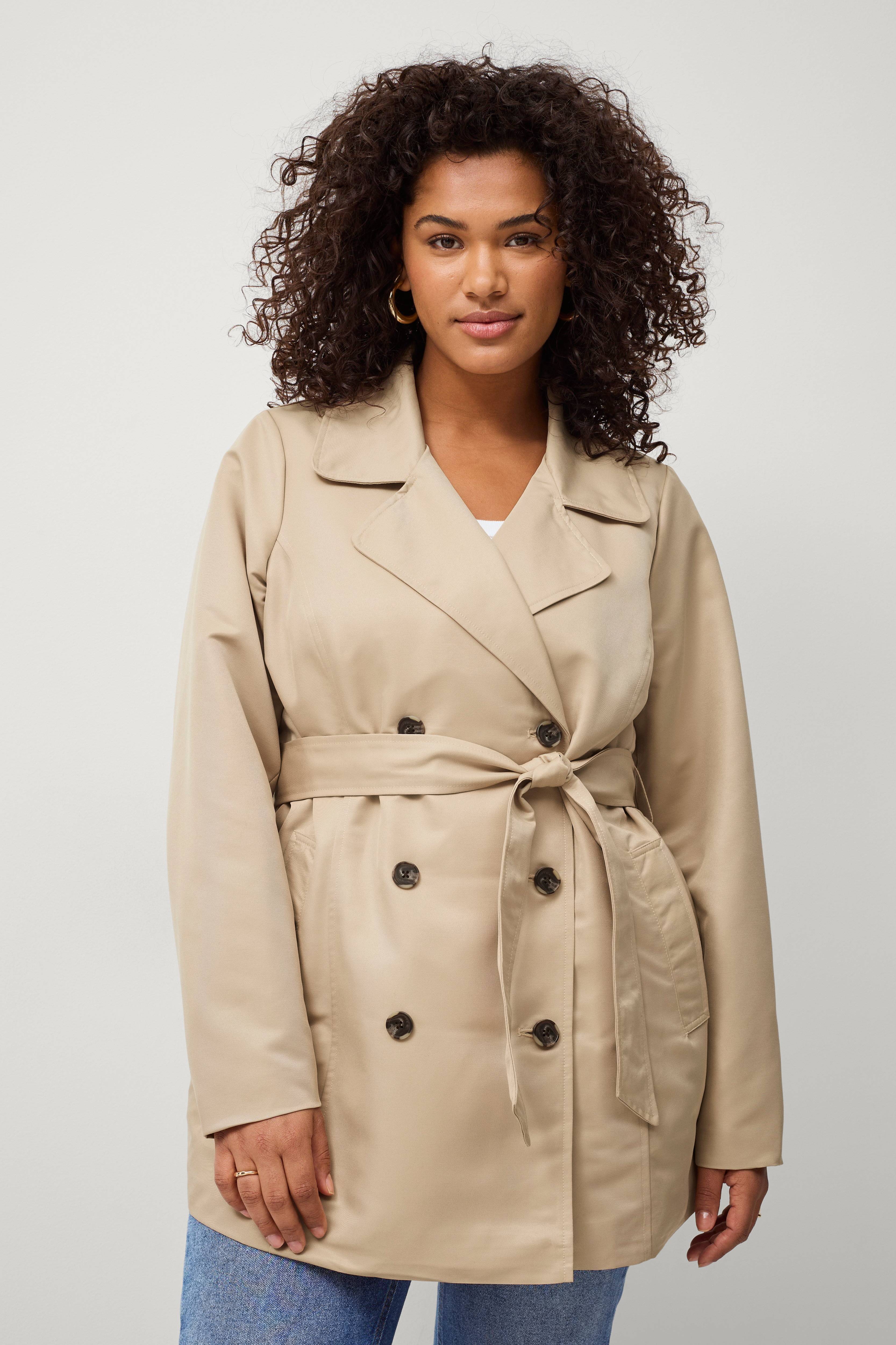 • Kort trenchcoat• Dobbeltbrystet model• Aftageligt bindebælte ved taljen• To lommer• Store størrelser• Længde: 81 cm i størrelse S