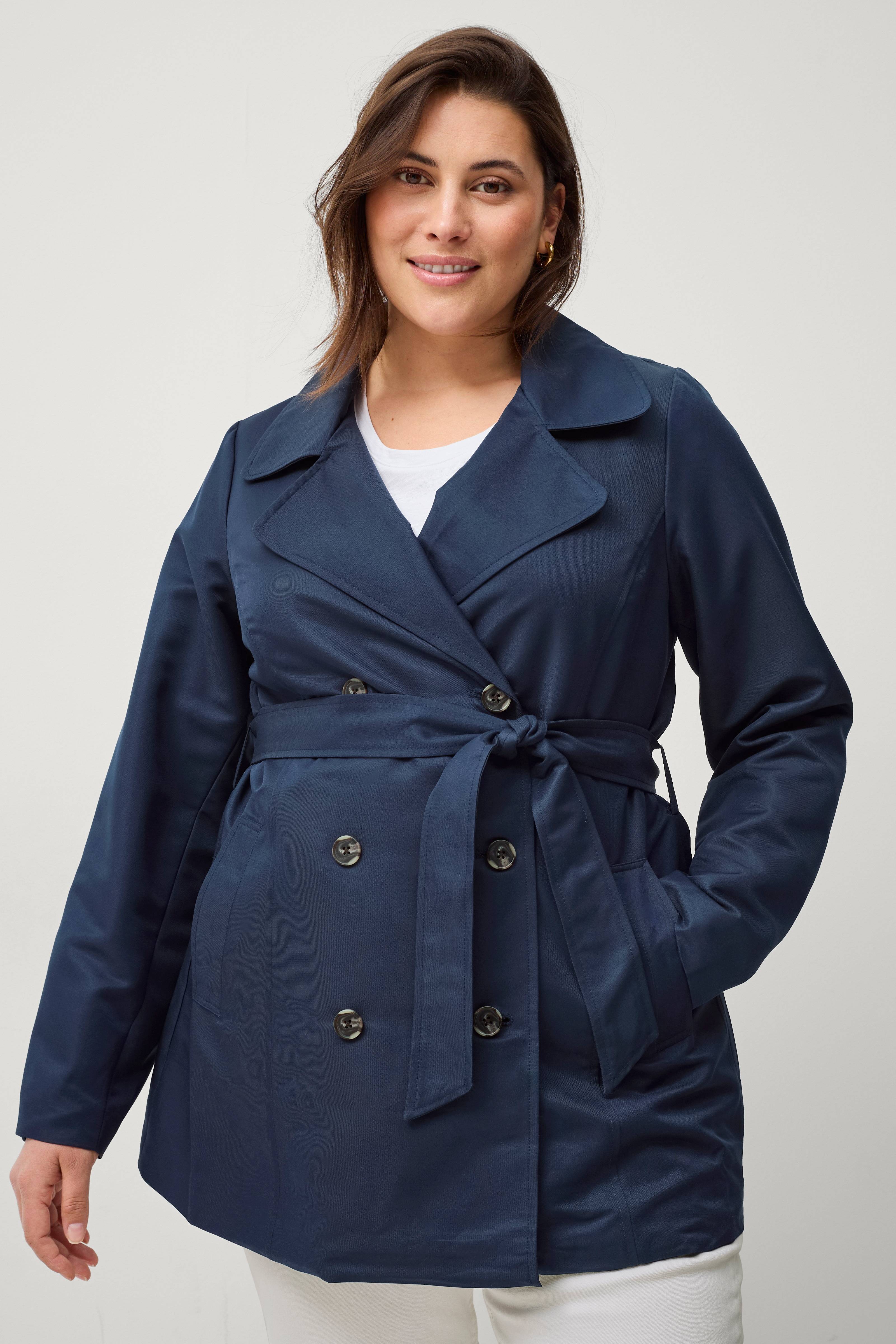 • Kort trenchcoat• Dobbeltbrystet model• Aftageligt bindebælte ved taljen• To lommer• Store størrelser• Længde: 81 cm i størrelse S