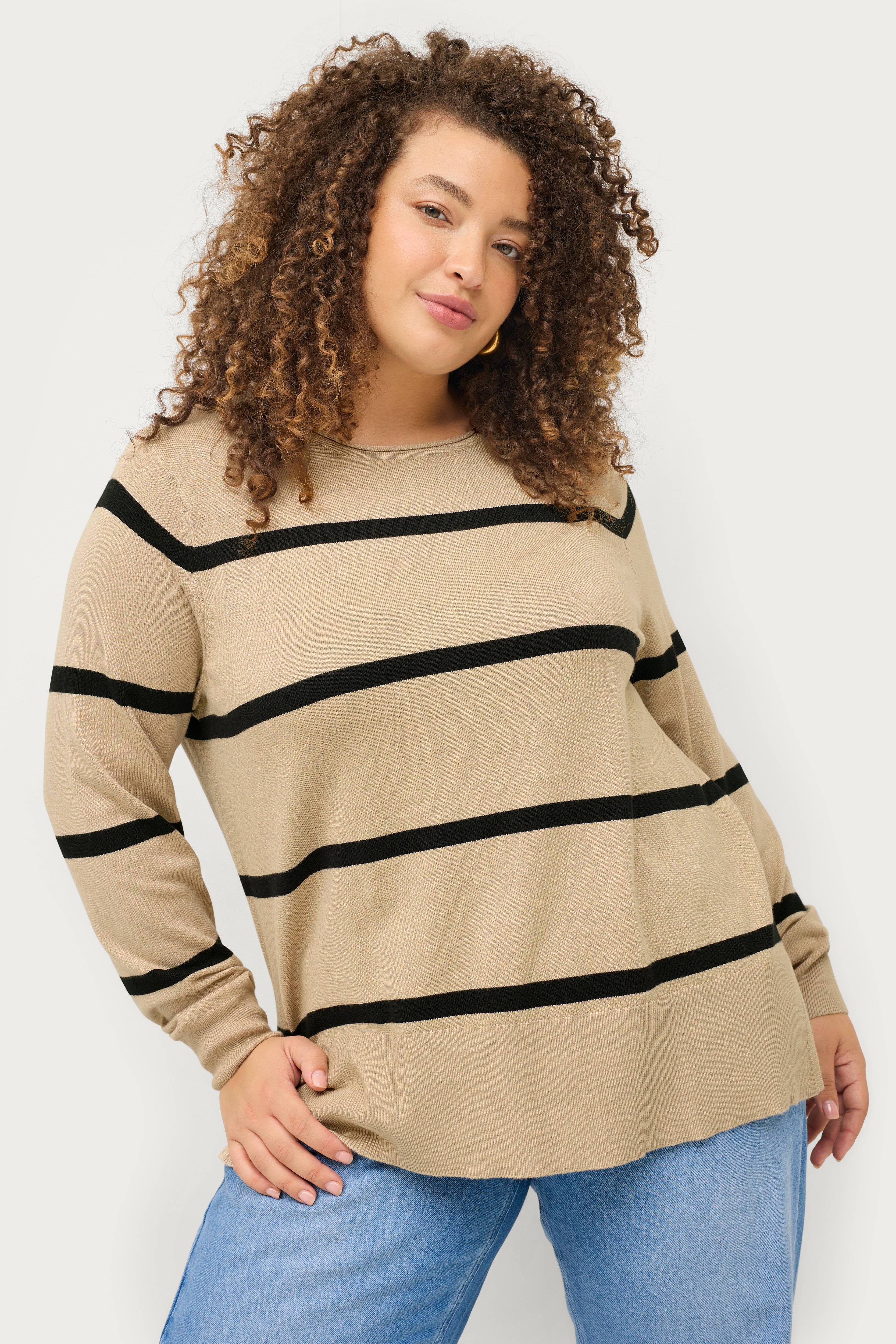 • Store størrelser• Lige model med strikkede striber• Halsudskæring med rullekant• Ribstrik ved manchetterne og nederst med slids i siderne