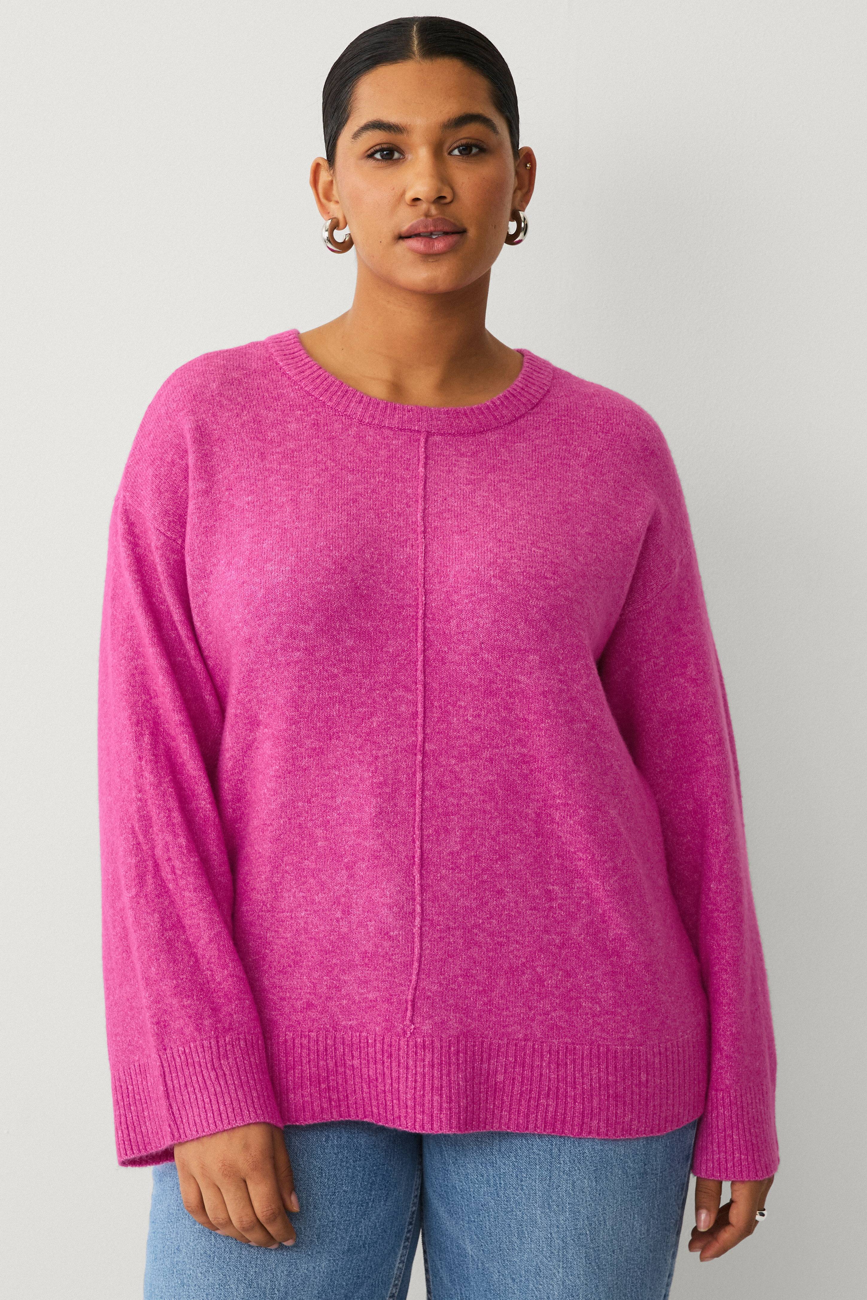 • Strikket trøje i uldblanding• Dekorativ, vertikal søm midt foran• Rund halsudskæring• Ribmanchetter ved manchetterne og nederst• Store størrelser